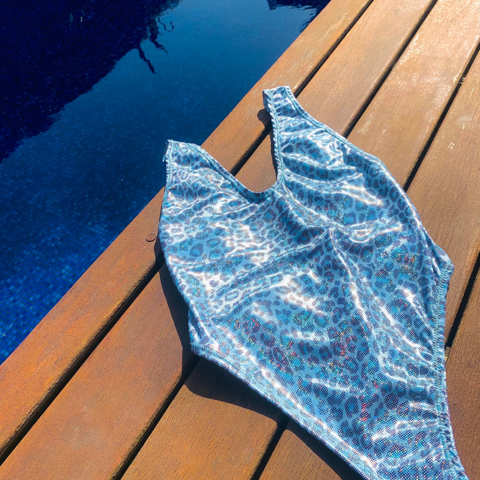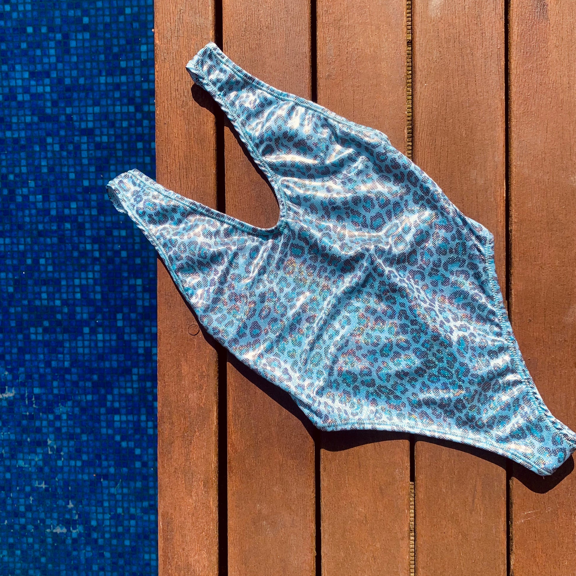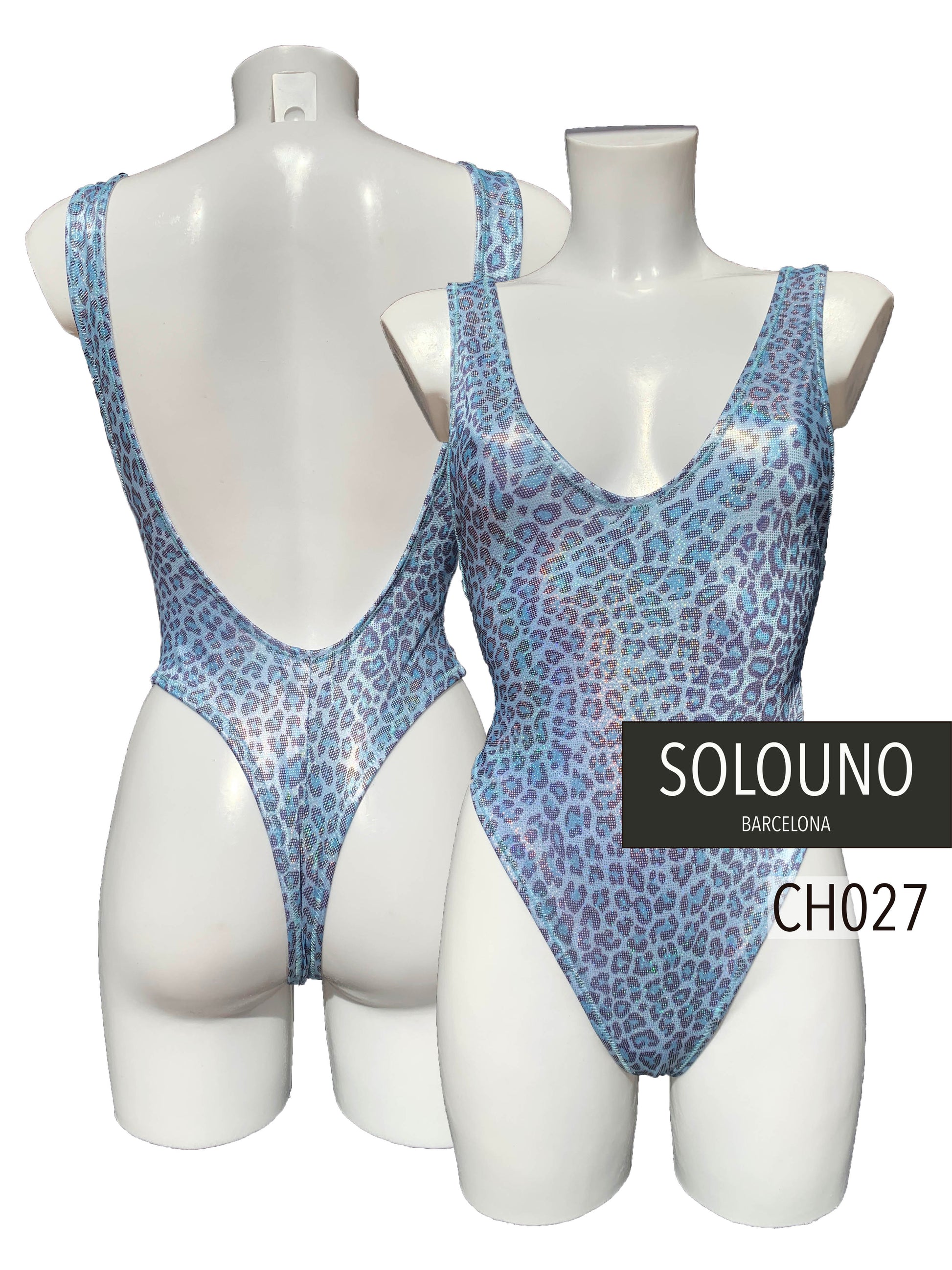 Bañador básico en estampado azul leopardo, con escote en la espalda y braguita tipo tanga.