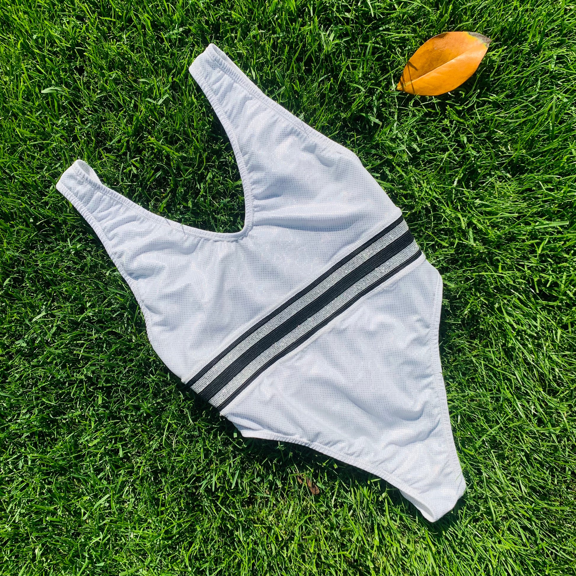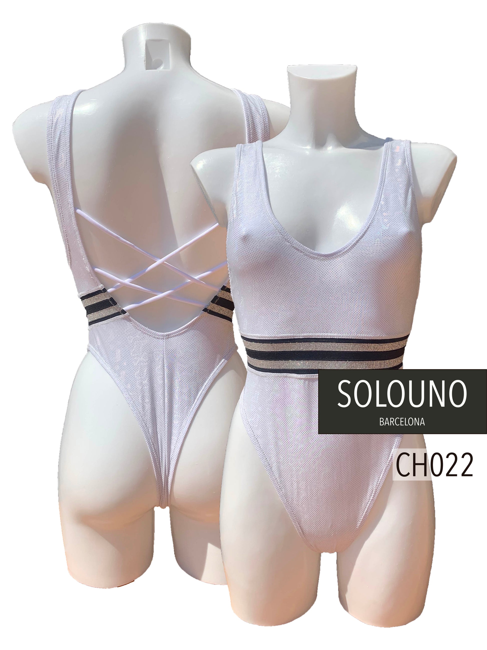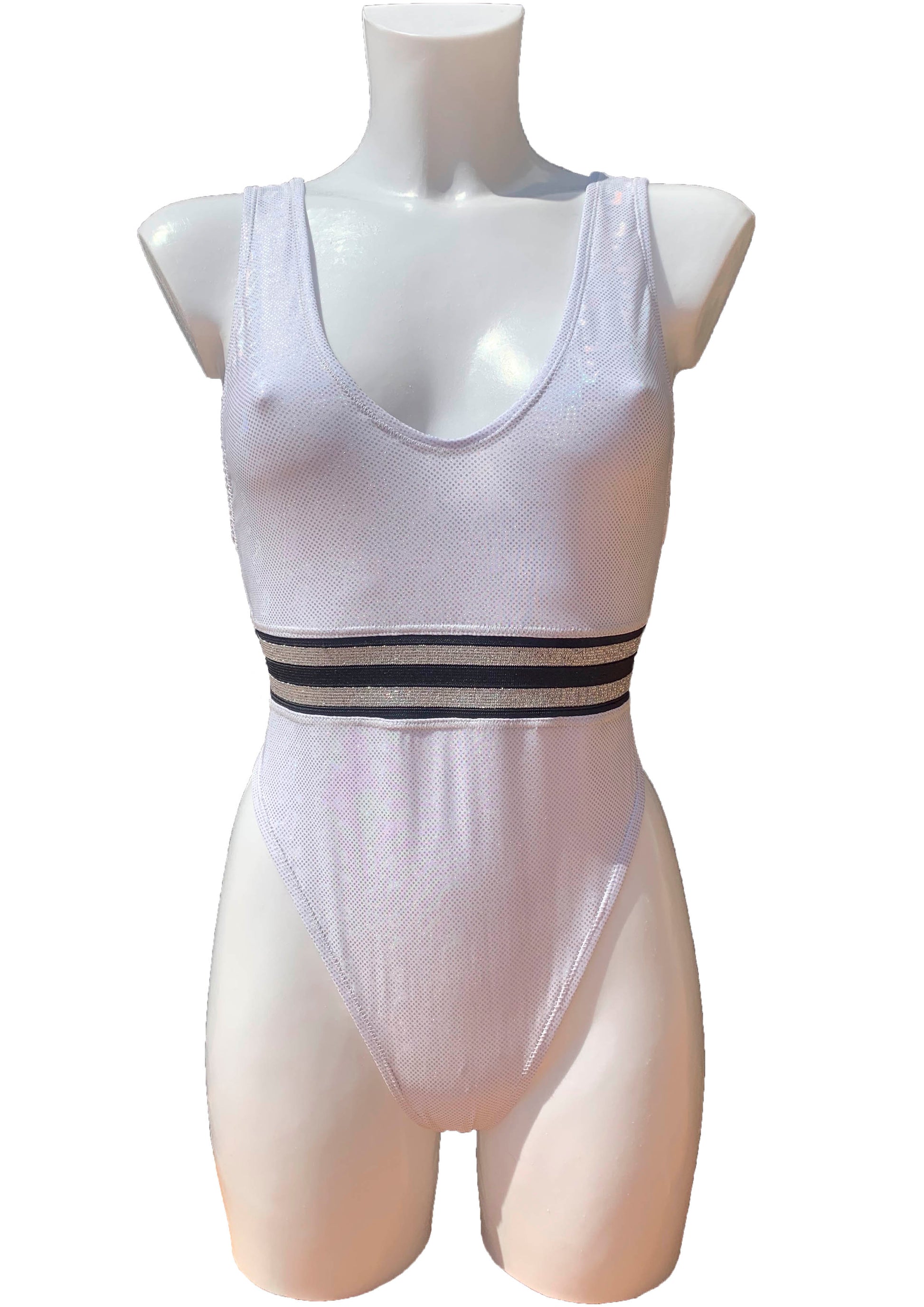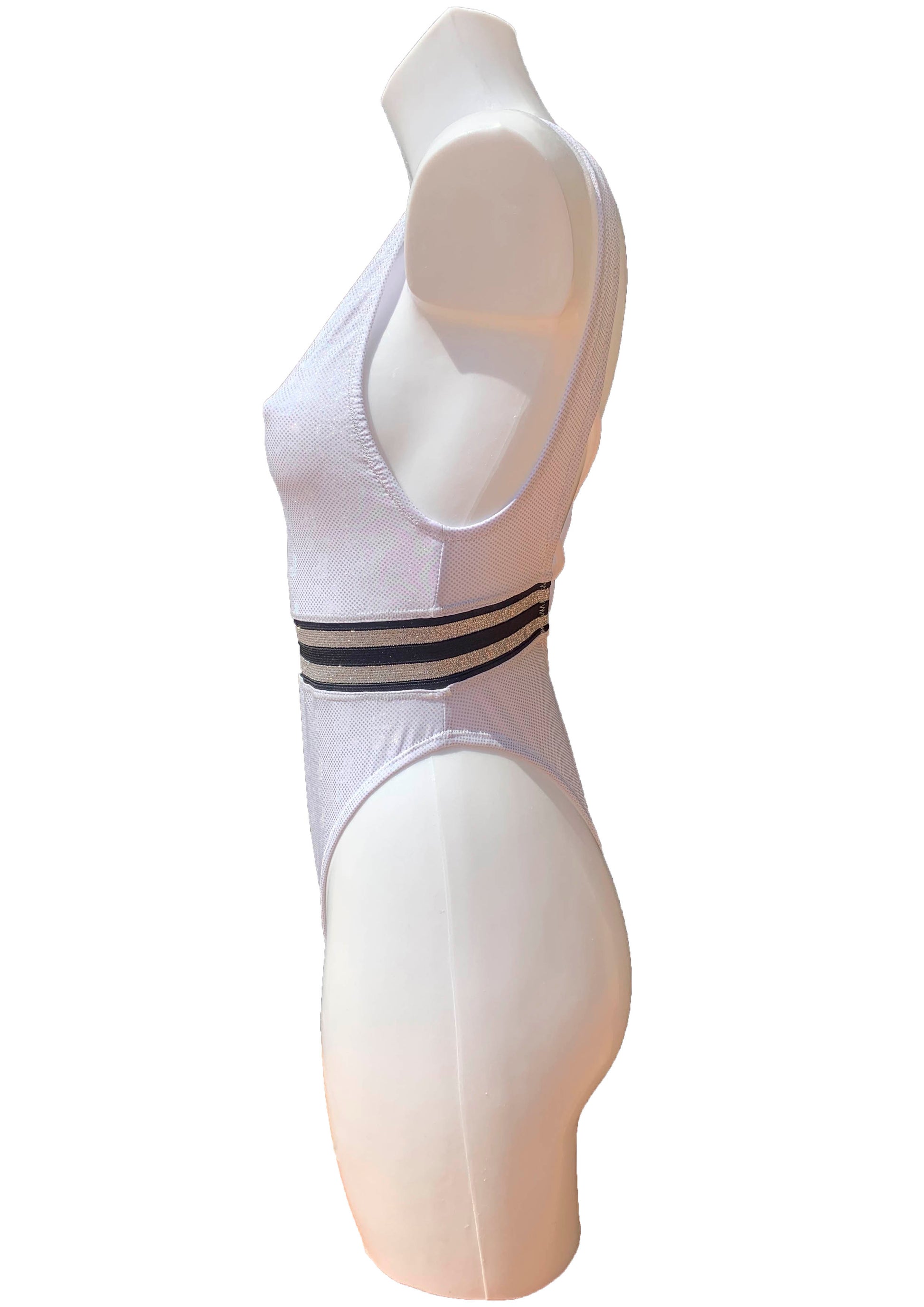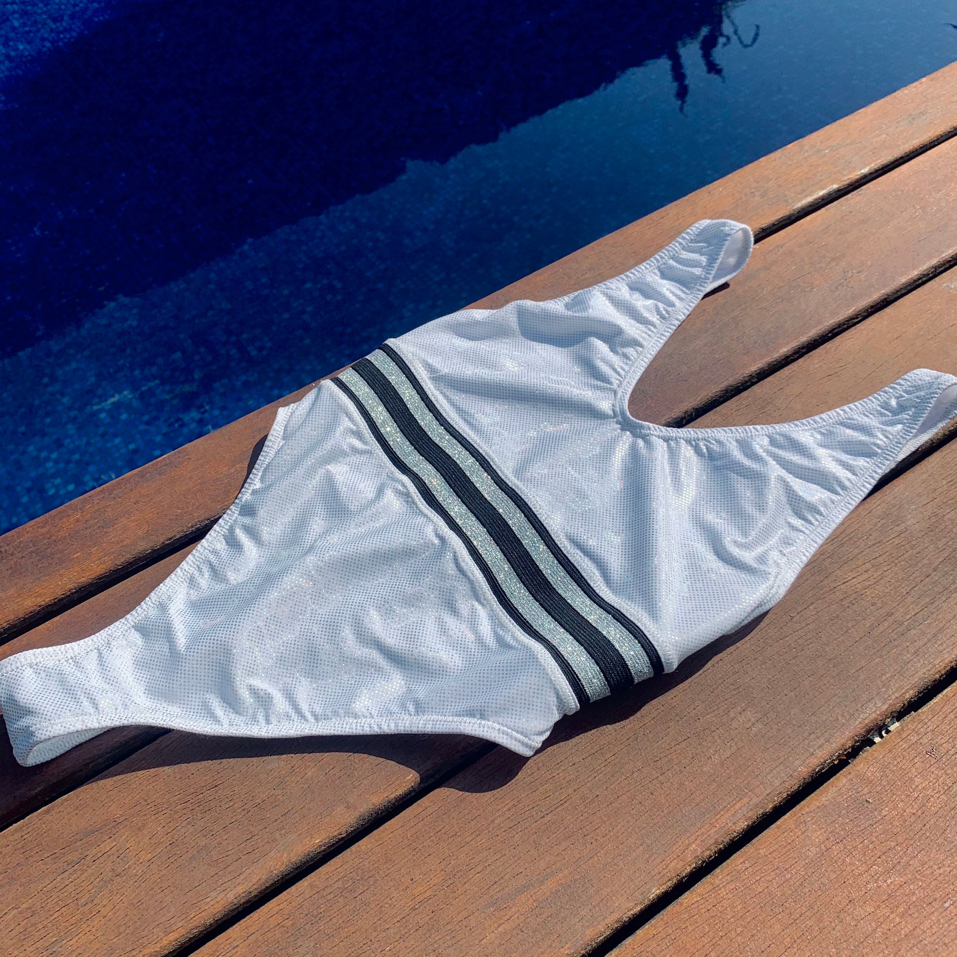 Bañador básico en color blanco metalizado, con escote en la espalda y detalle de tira negra en la cintura, en la misma espalda cuatro tiras en cruz y braguita tipo tanga.