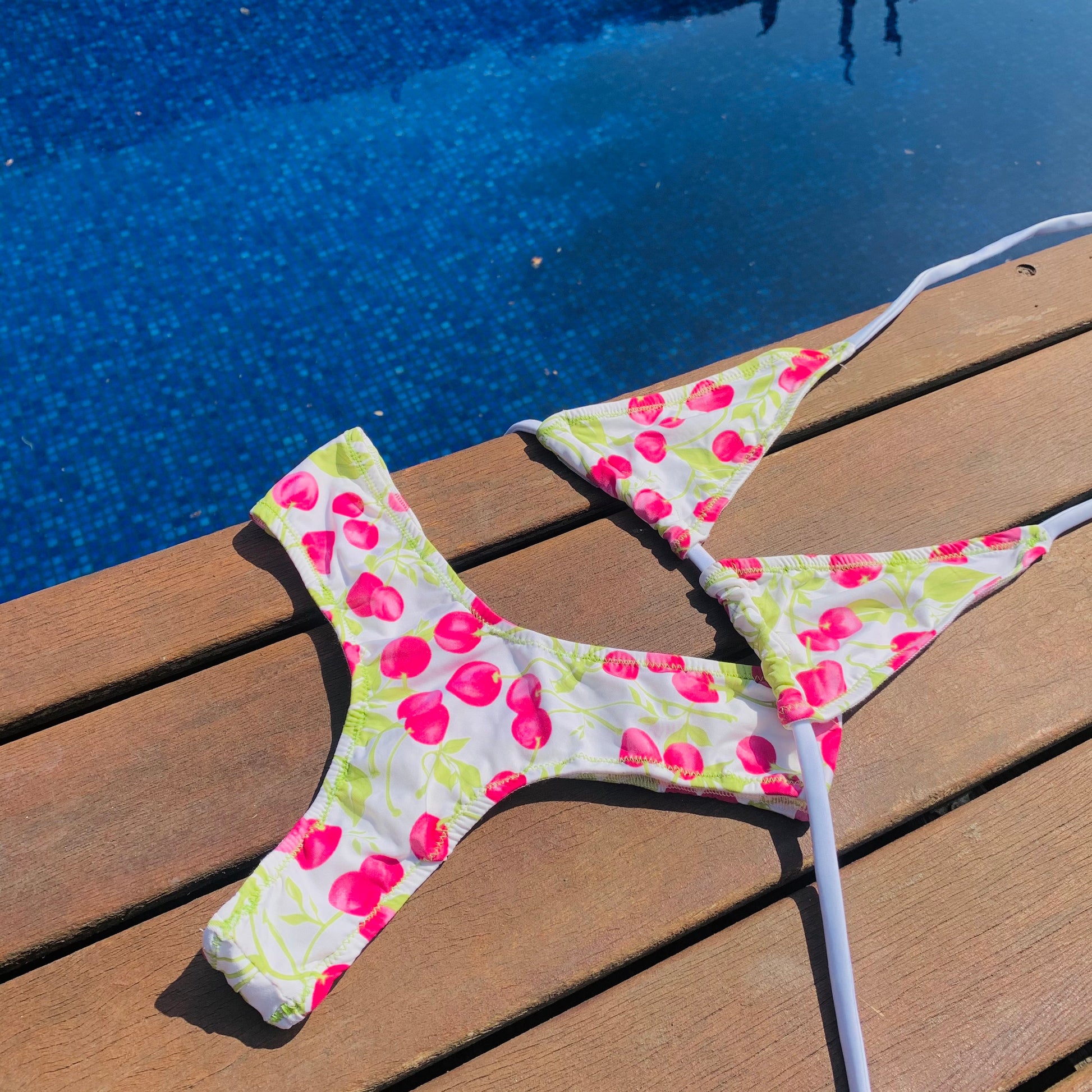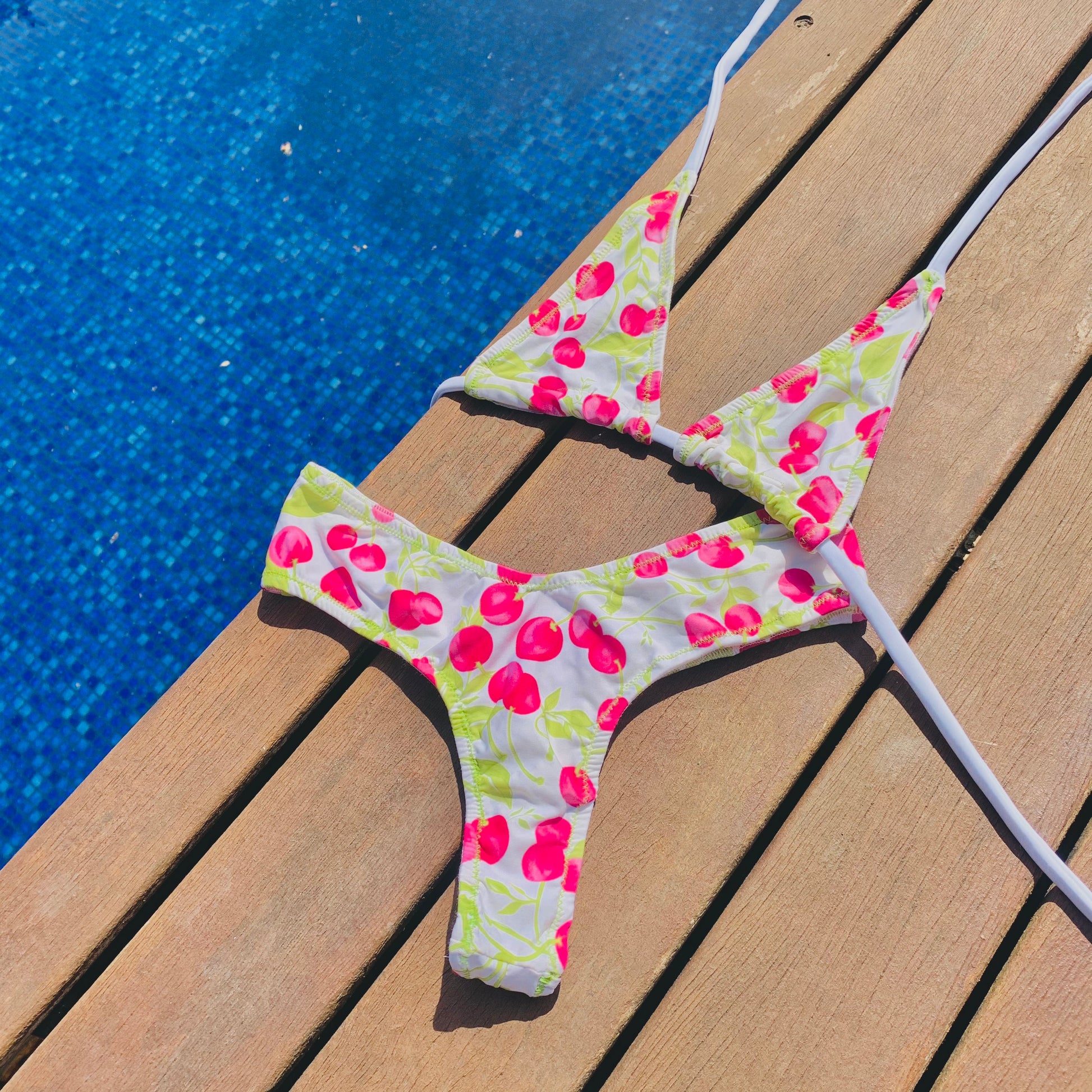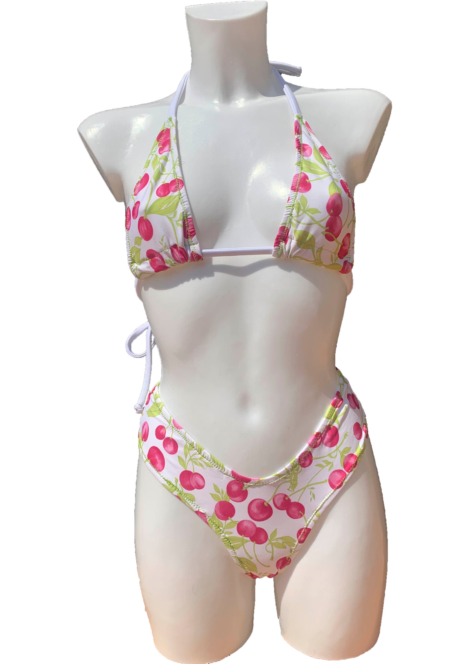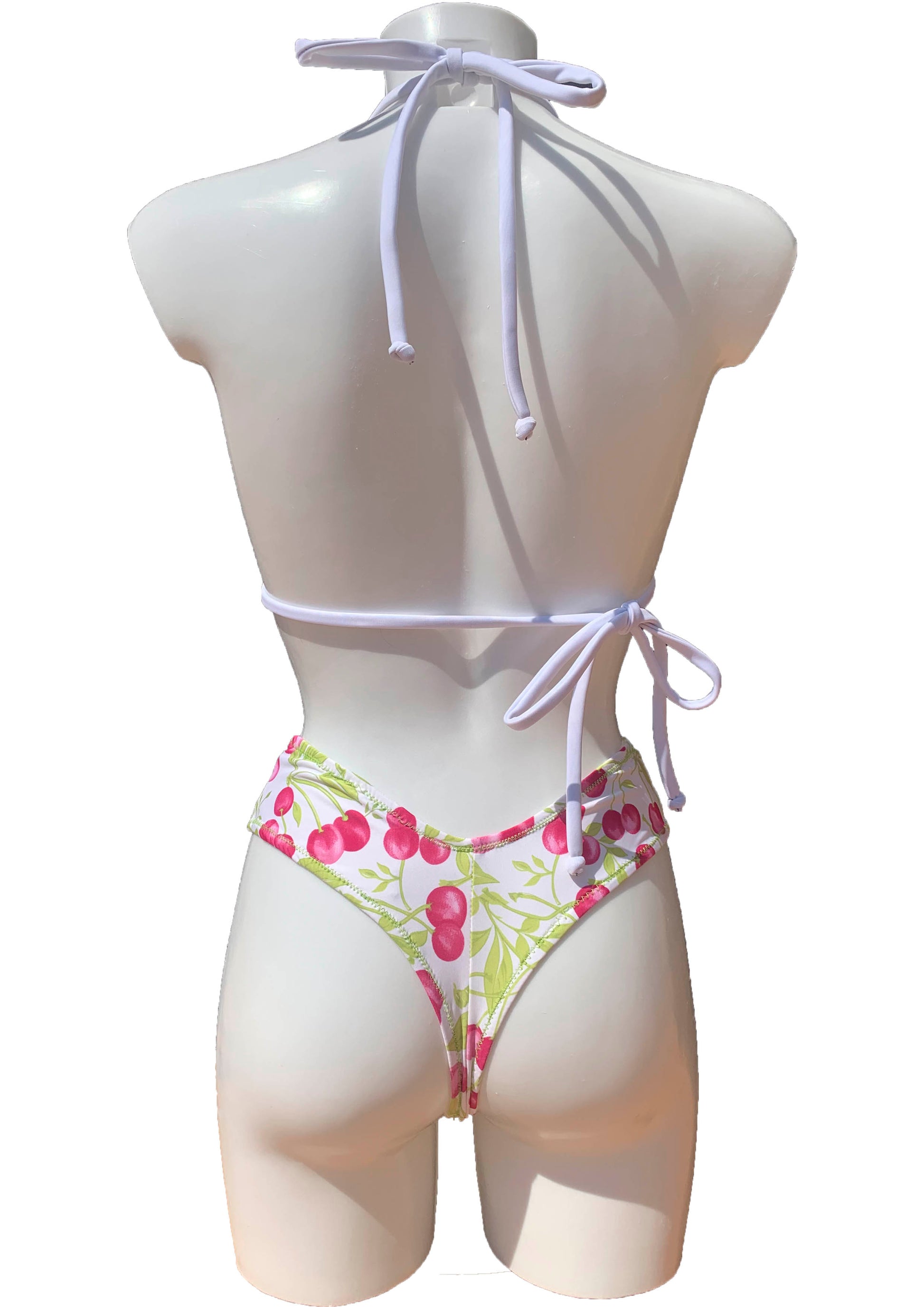 Bikini de dos piezas en tejido estampado con cerezas. La braguita es de estilo tanga y la parte de arriba top triangulo mini (cubre lo justo), ajustado a cuello y espalda, adaptable a cualquier medida de pecho.