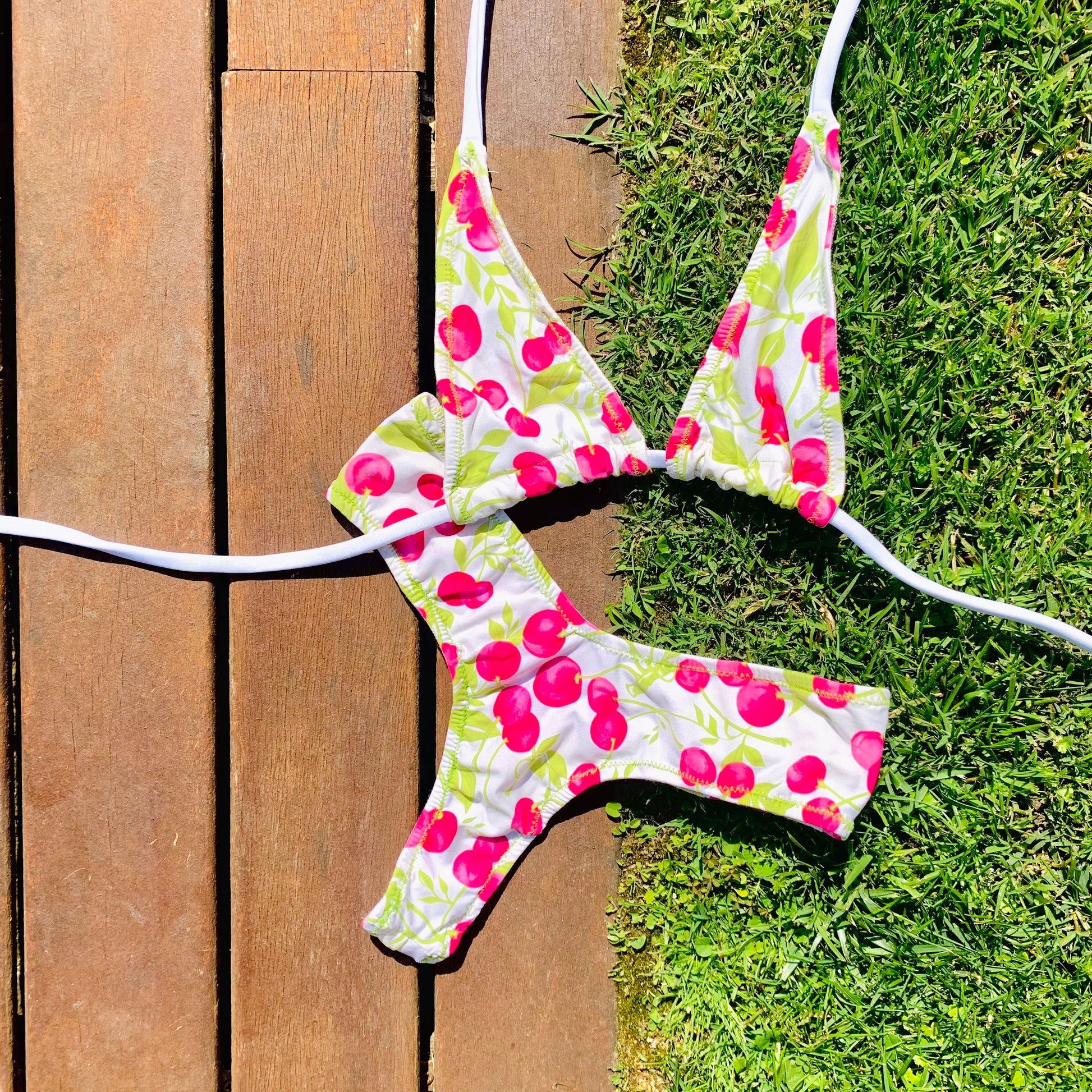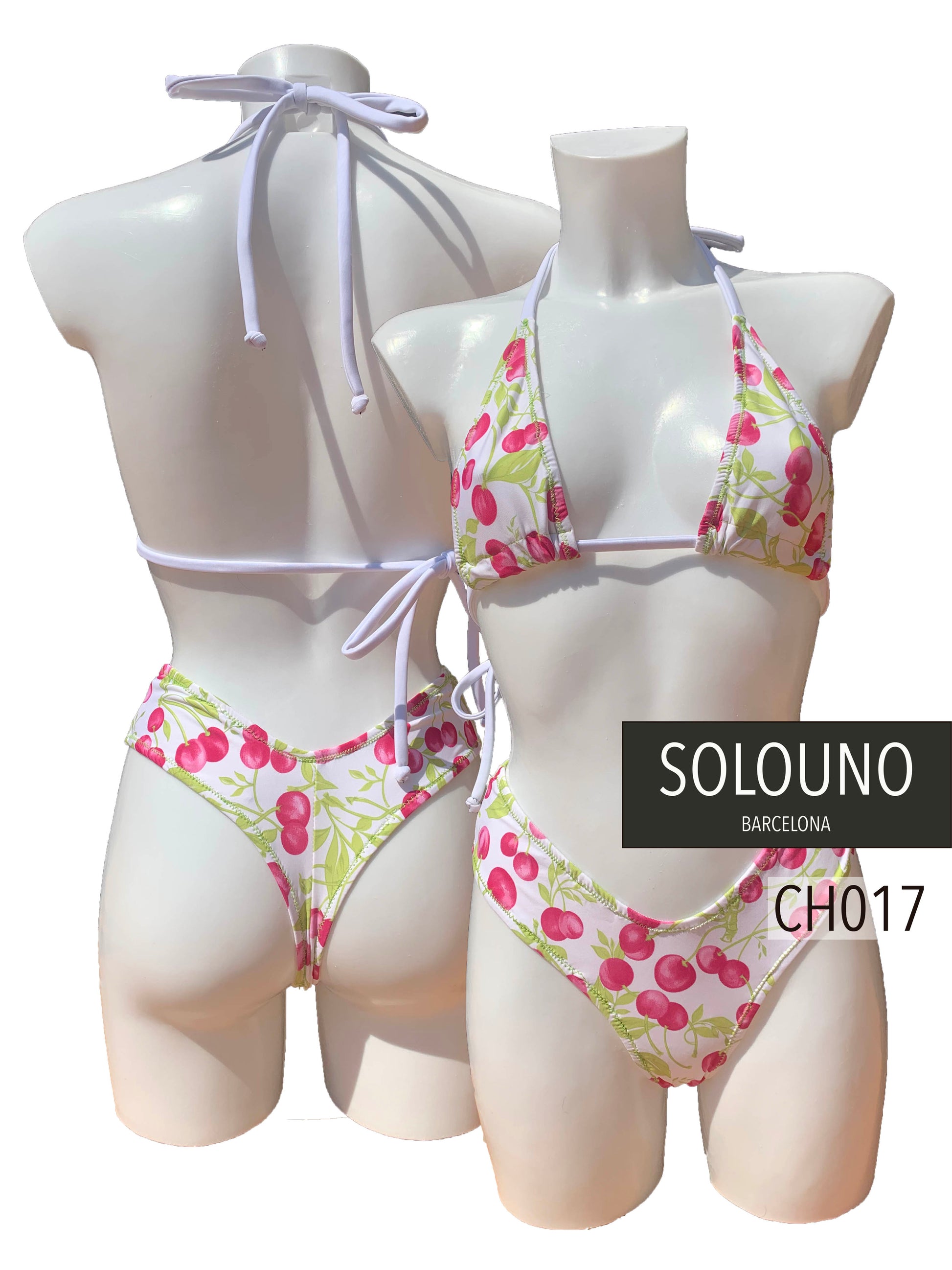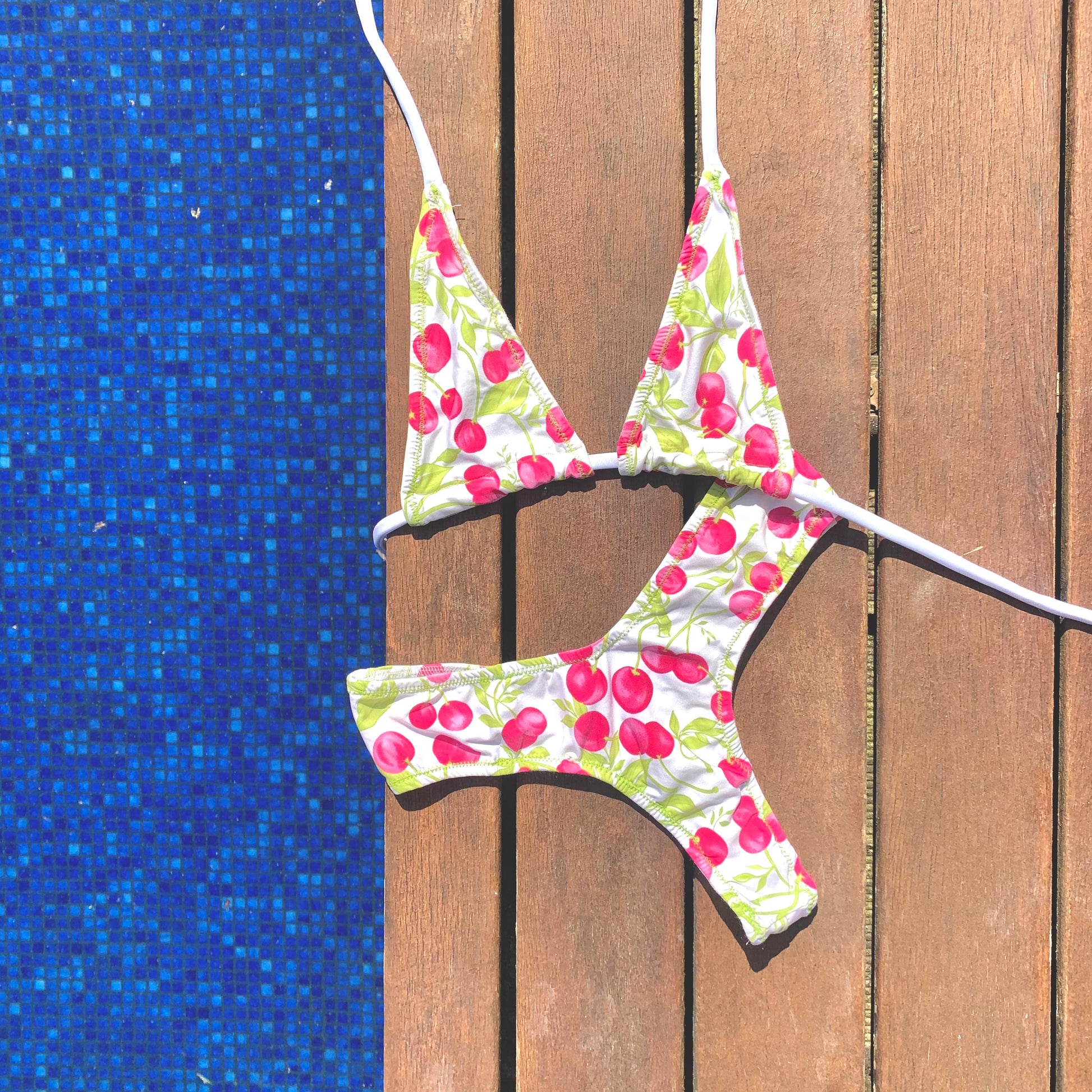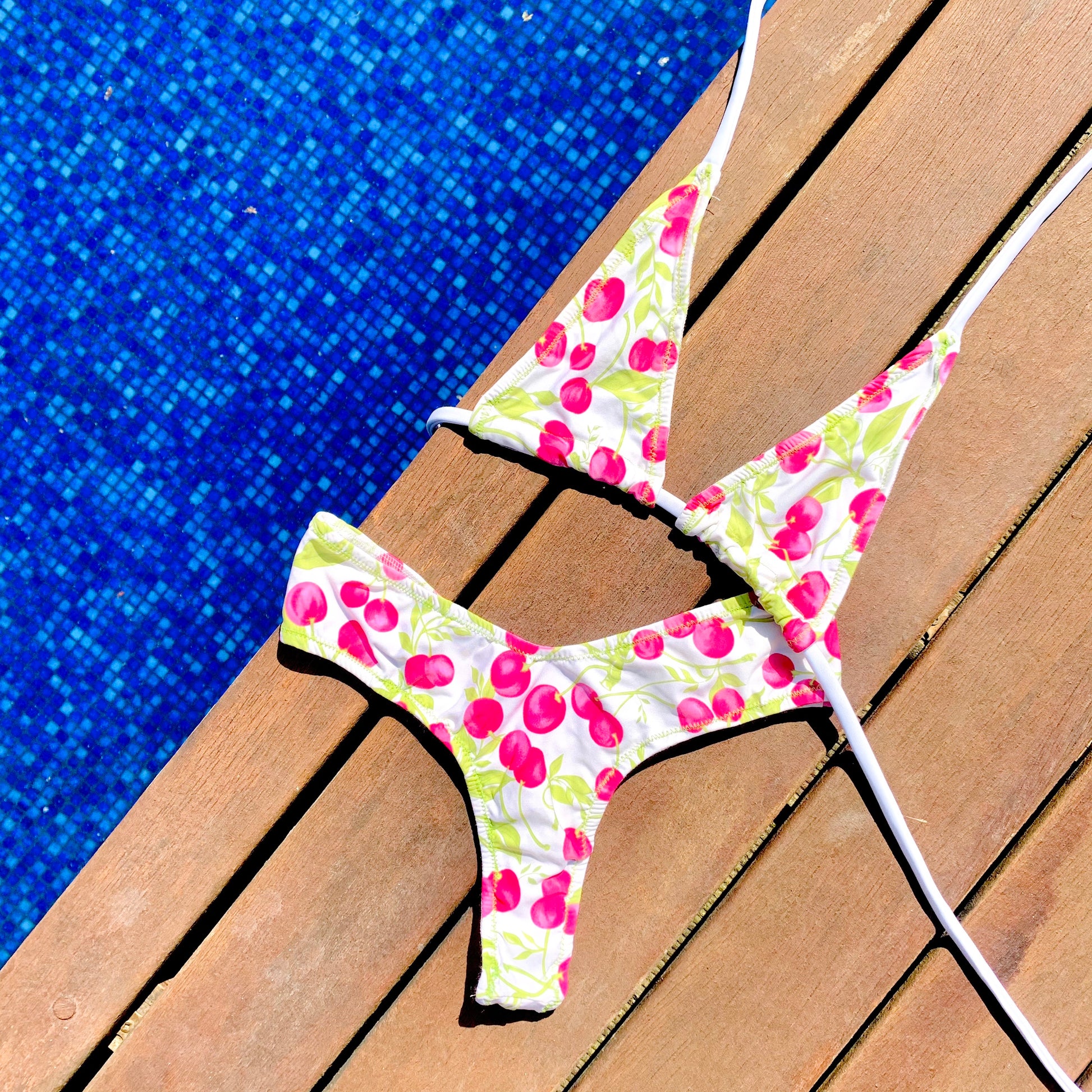 Bikini de dos piezas en tejido estampado con cerezas. La braguita es de estilo tanga y la parte de arriba top triangulo mini (cubre lo justo), ajustado a cuello y espalda, adaptable a cualquier medida de pecho.