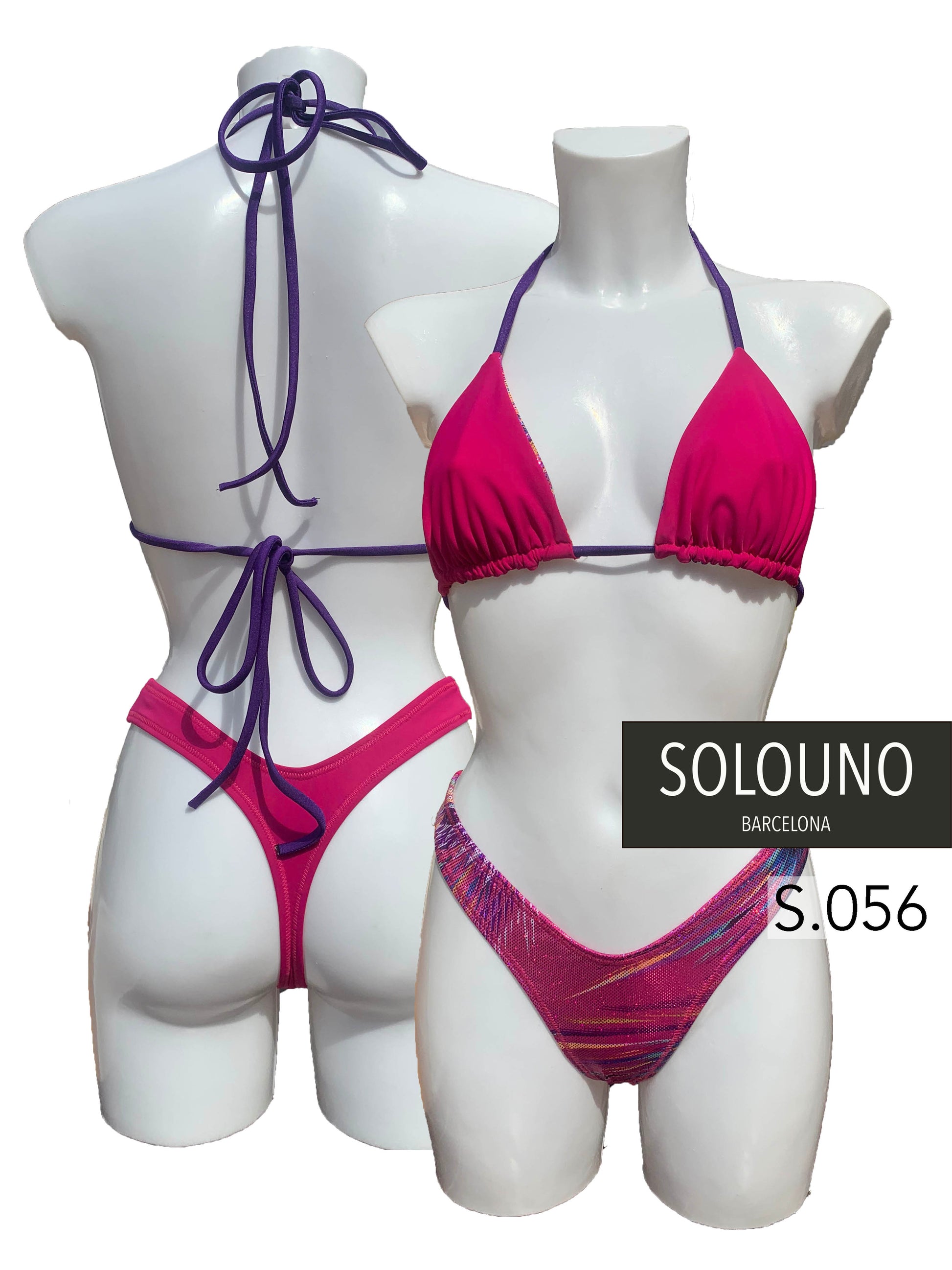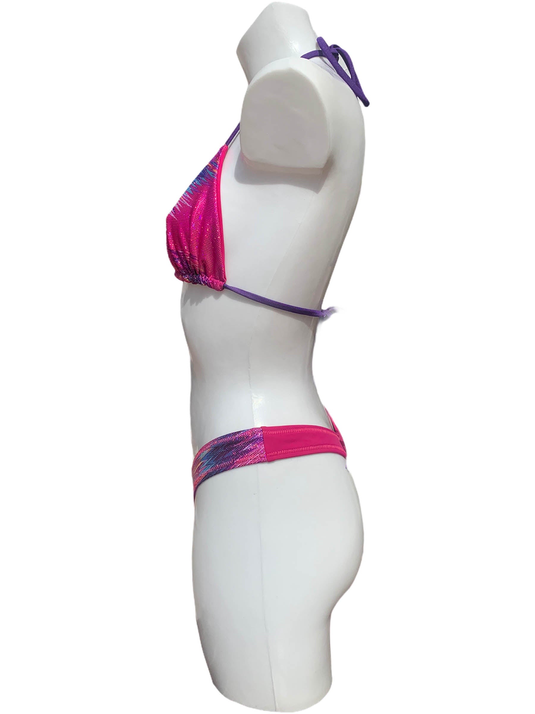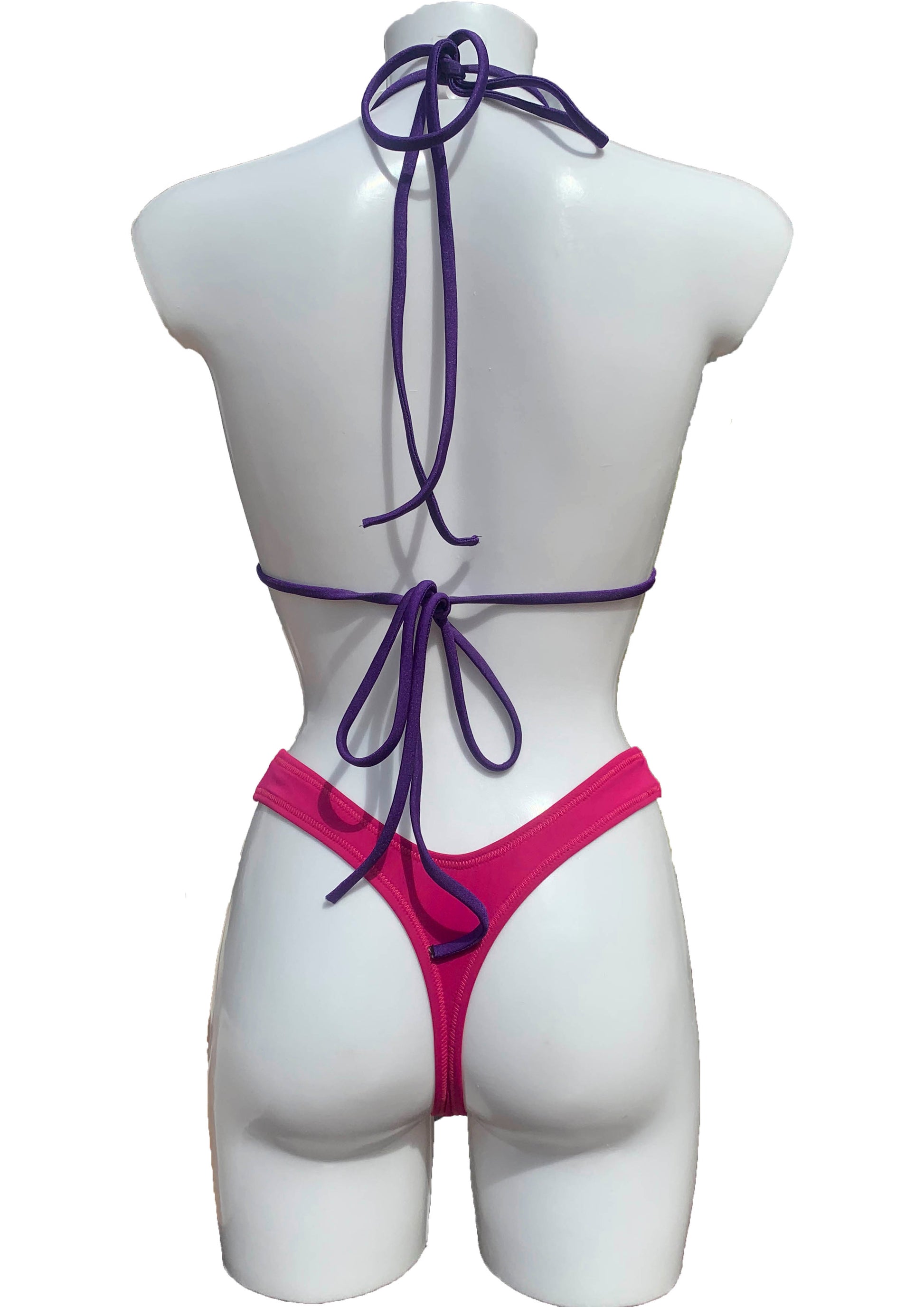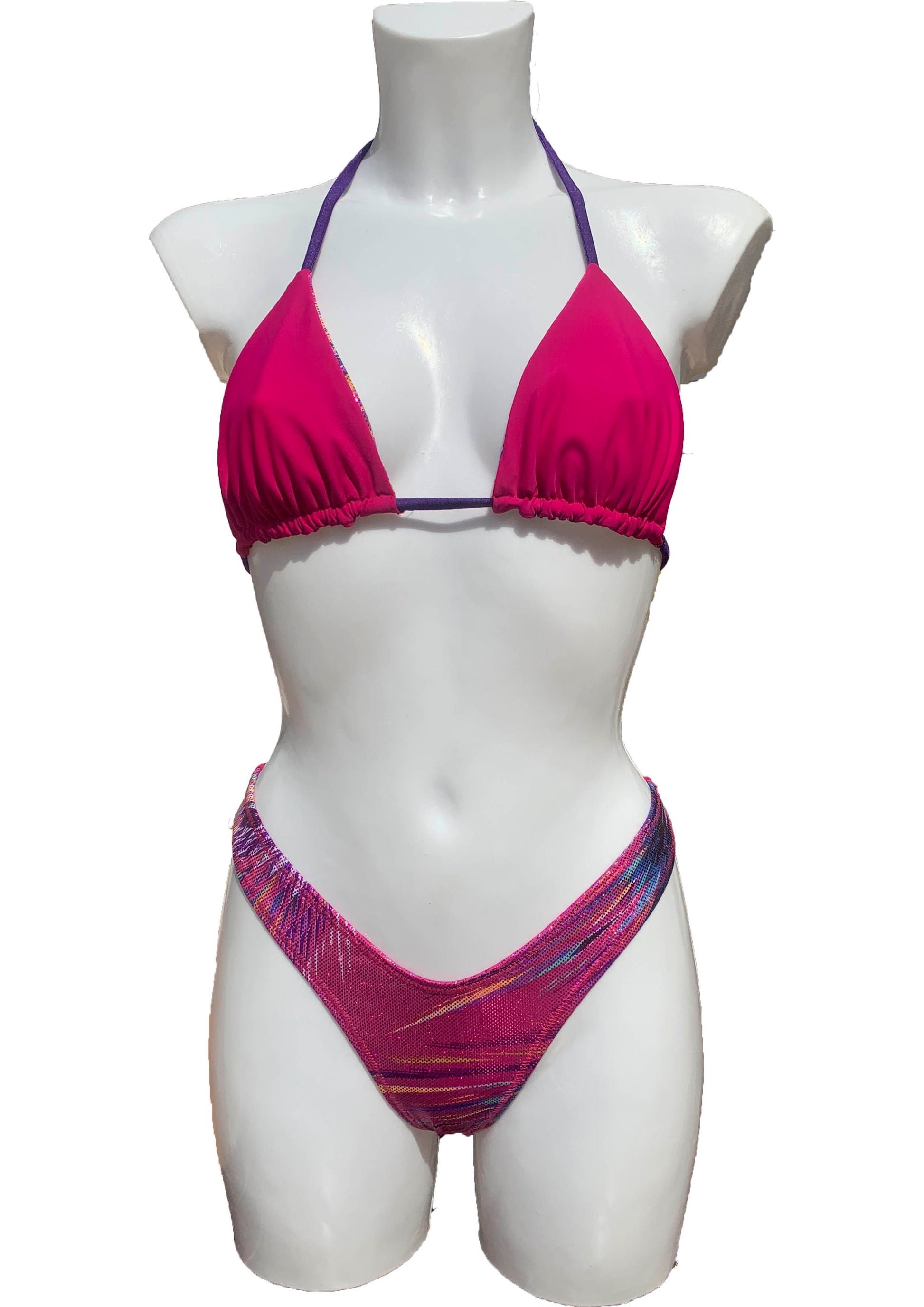 Elige que estilo de braguita prefieres: tanga, brasileña o braguita; con la parte delantera en estampado brillante y la trasera en fucsia y la parte de arriba top triangulo reversible en tejido estampado brillante y por el otro lado fucsia; con tiras en violeta, ajustado a cuello y espalda, adaptable a cualquier medida de pecho.