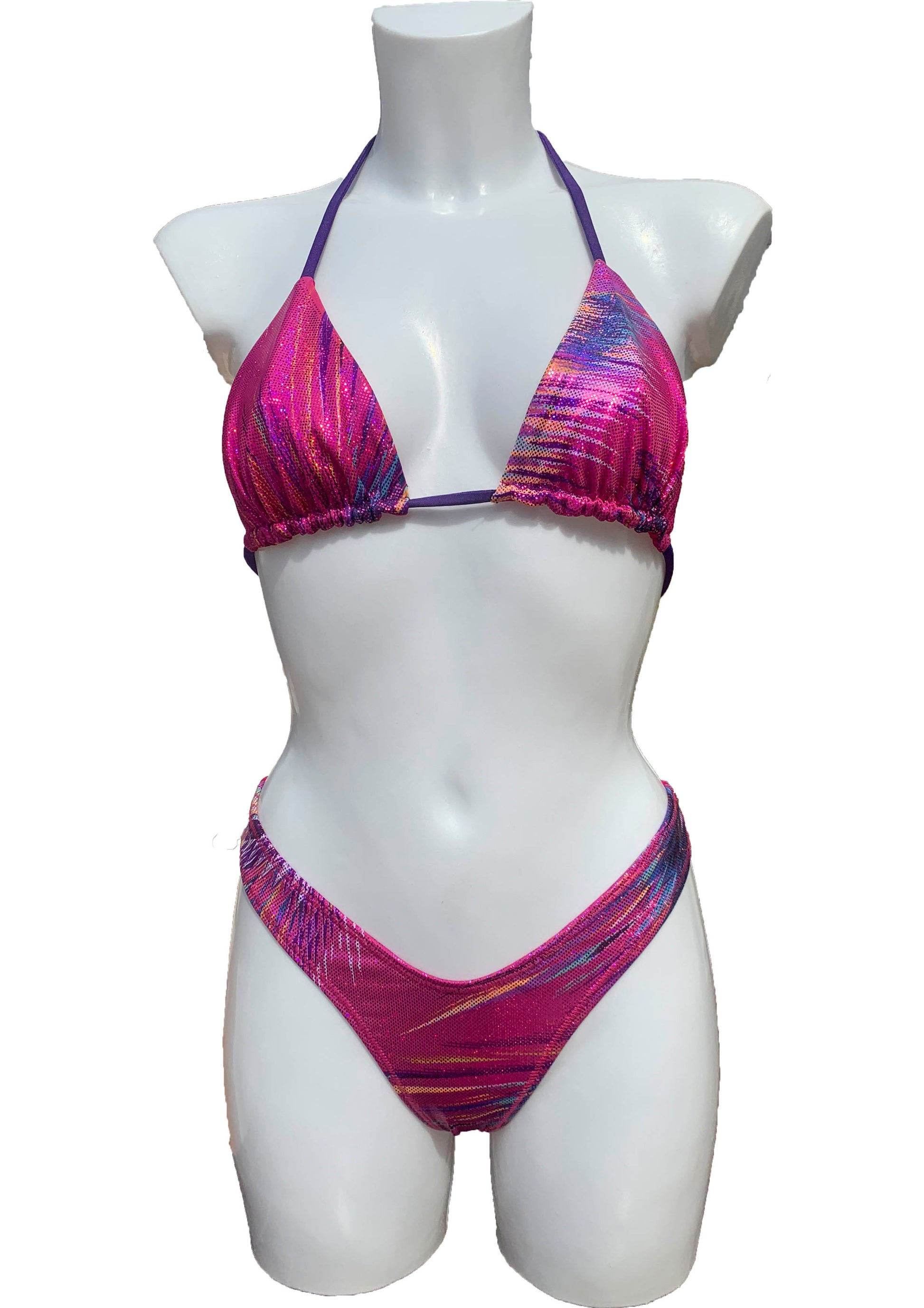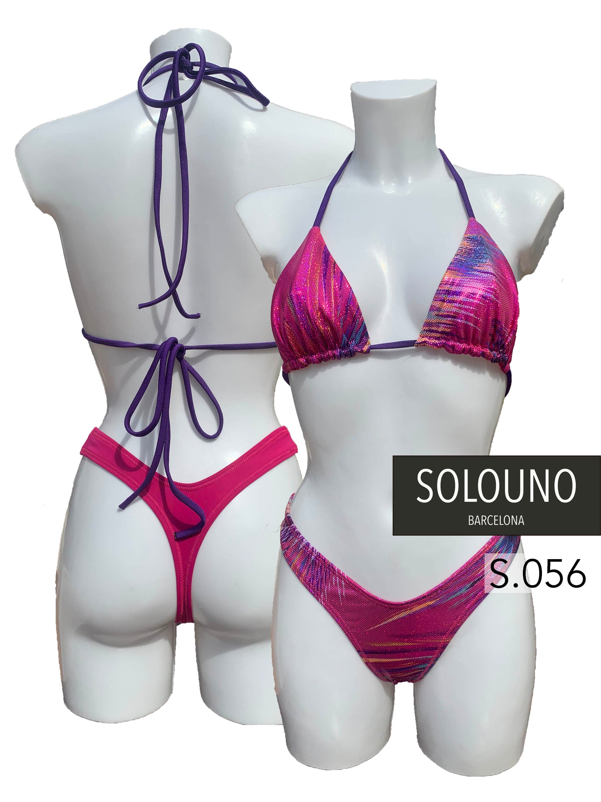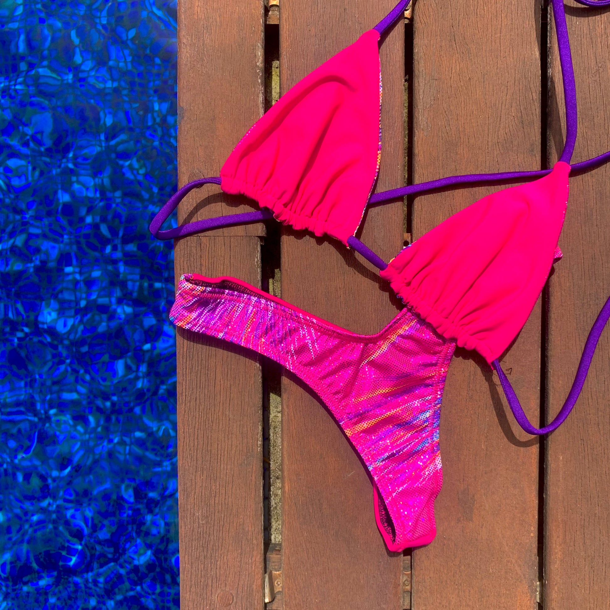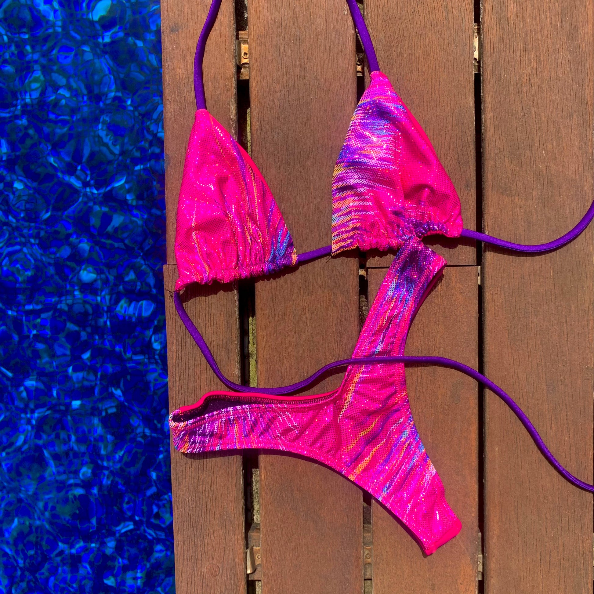 Elige que estilo de braguita prefieres: tanga, brasileña o braguita; con la parte delantera en estampado brillante y la trasera en fucsia y la parte de arriba top triangulo reversible en tejido estampado brillante y por el otro lado fucsia; con tiras en violeta, ajustado a cuello y espalda, adaptable a cualquier medida de pecho.