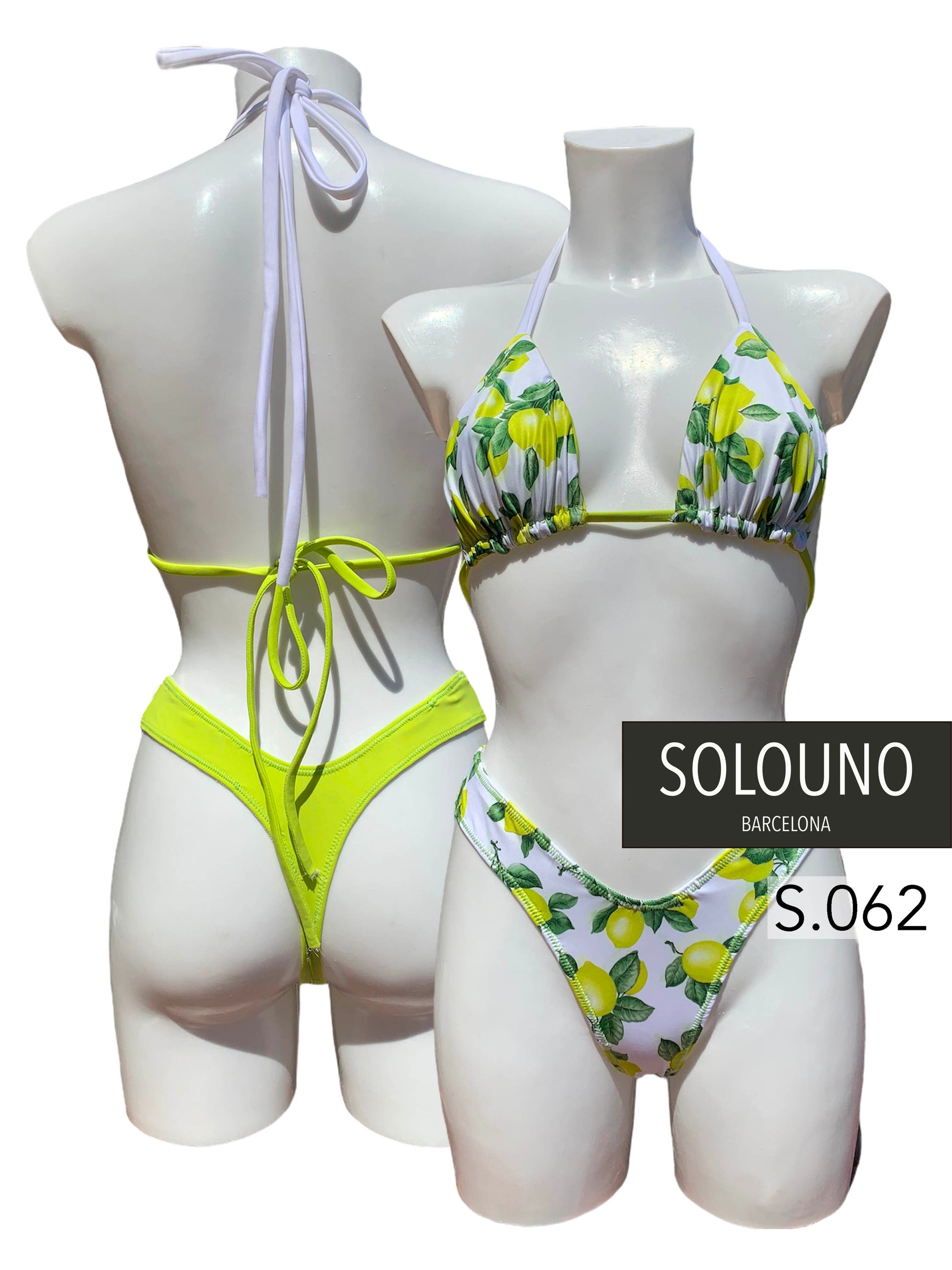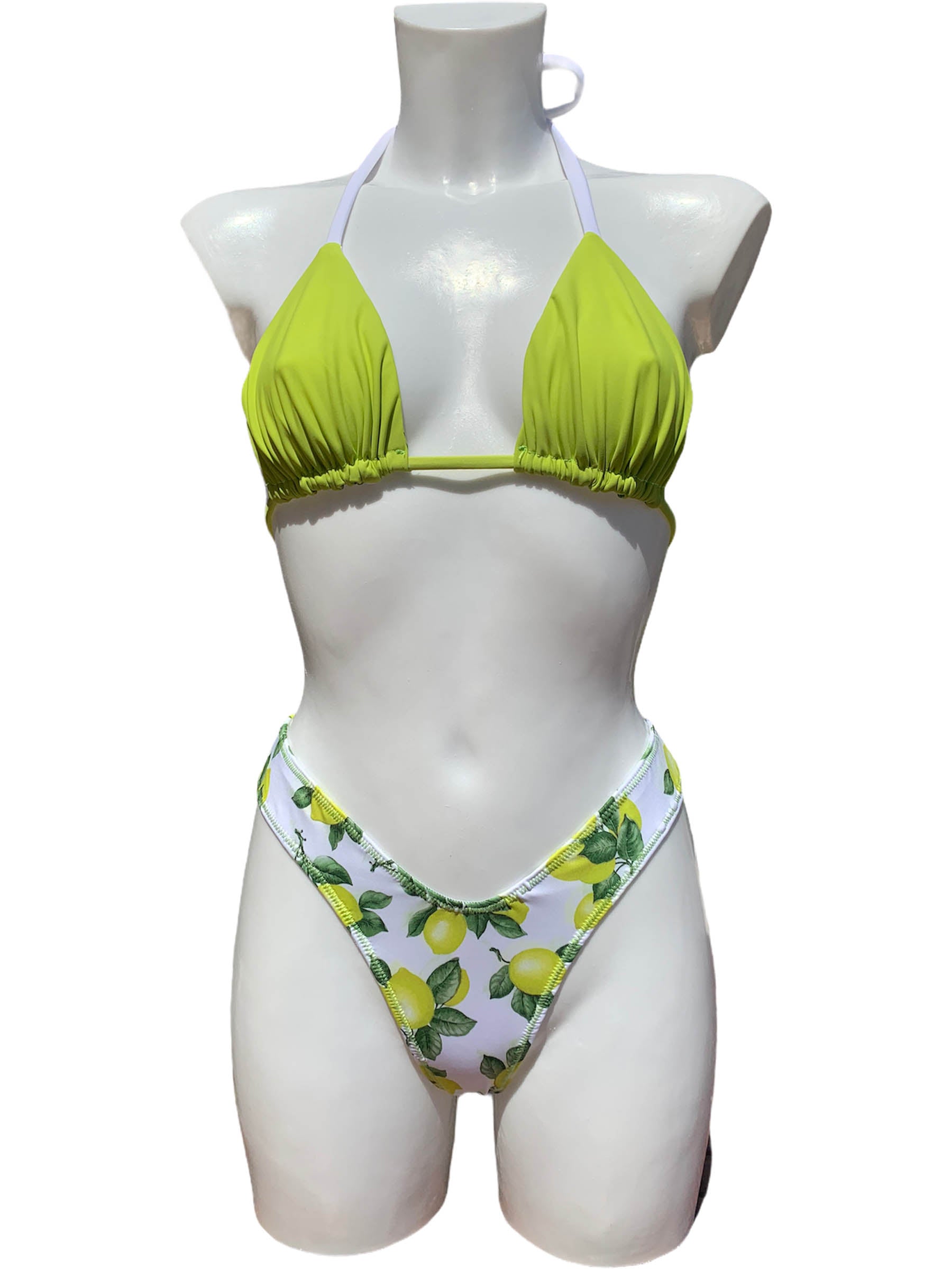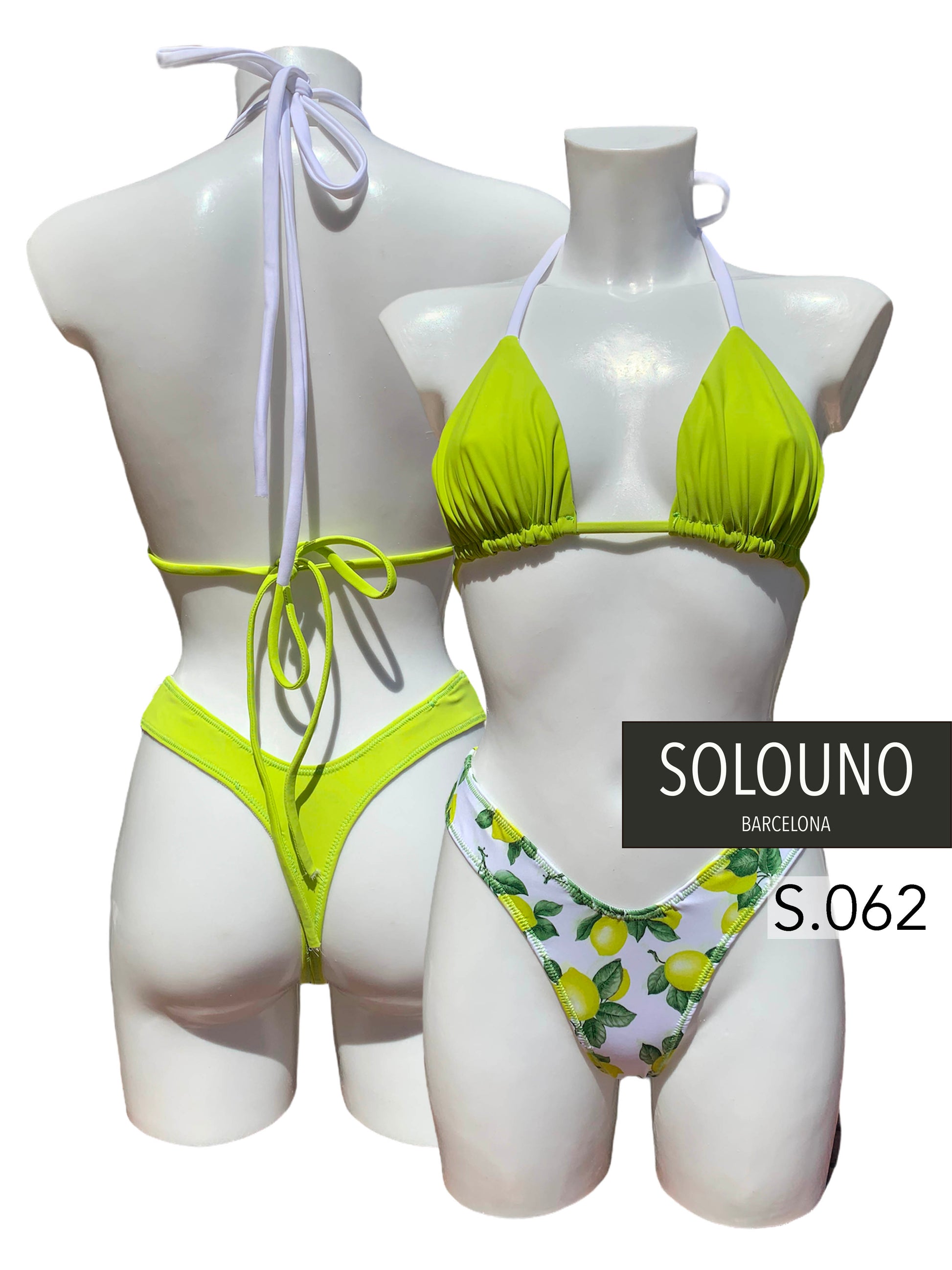 Elige que estilo de braguita prefieres: tanga, brasileña o braguita; con la parte delantera en estampado y la trasera en lima, la parte de arriba top triangulo reversible en tejido estampado y por el otro lado lima; con tiras en blanco y lima, ajustado a cuello y espalda, adaptable a cualquier medida de pecho.