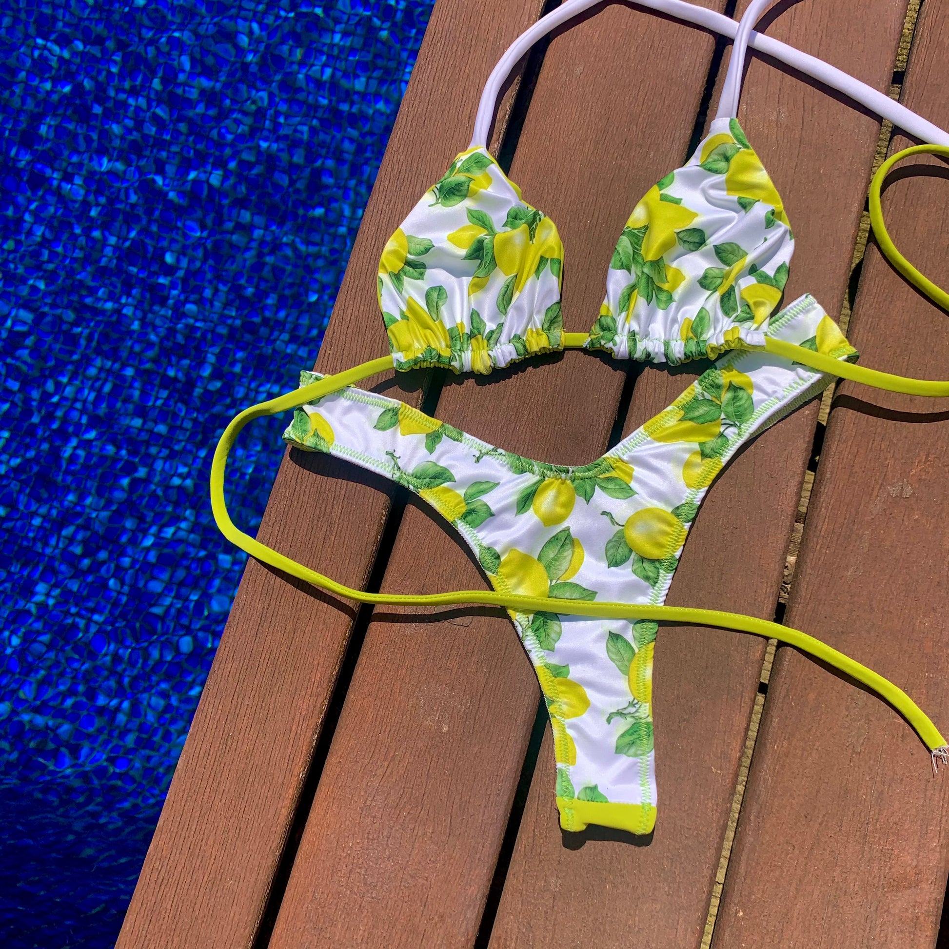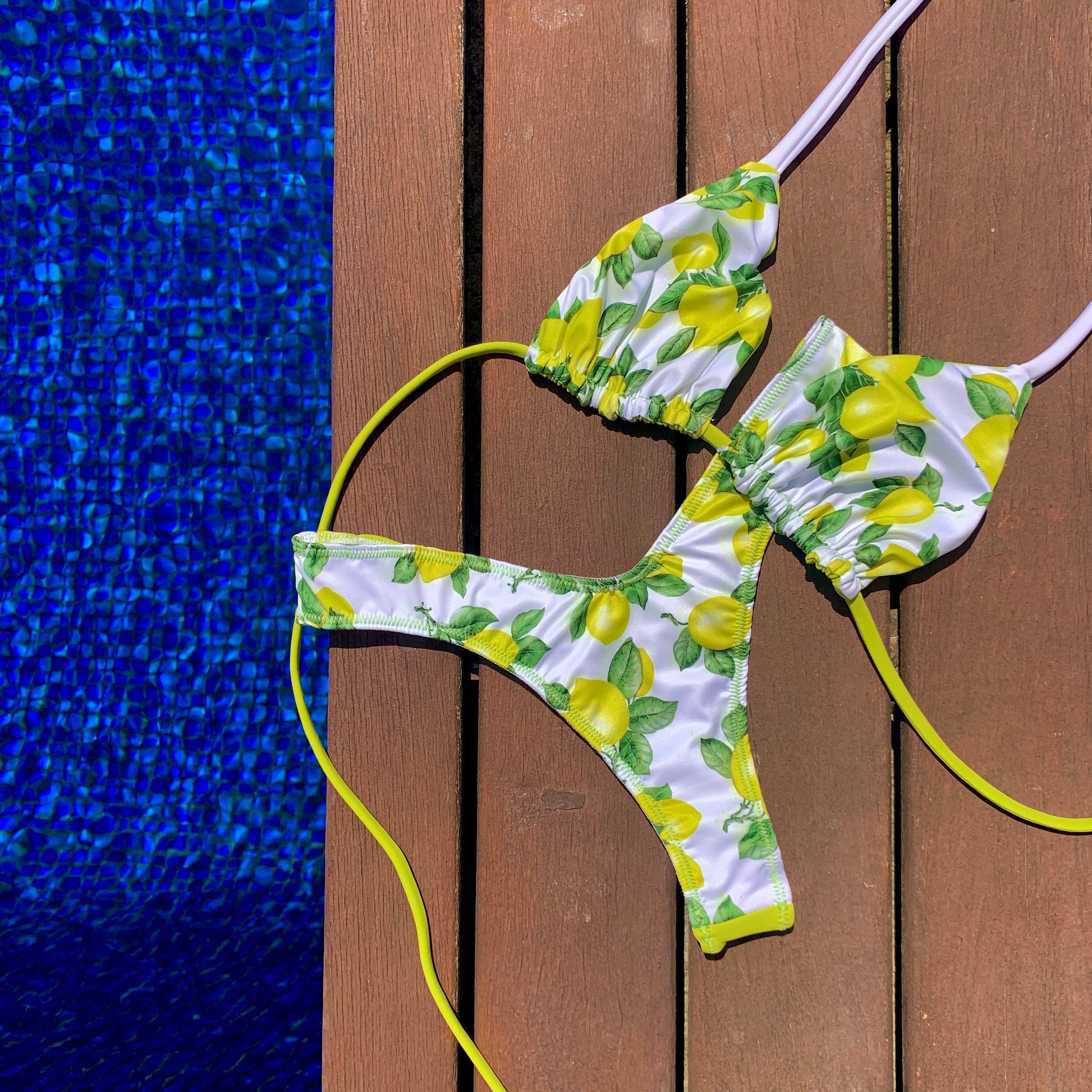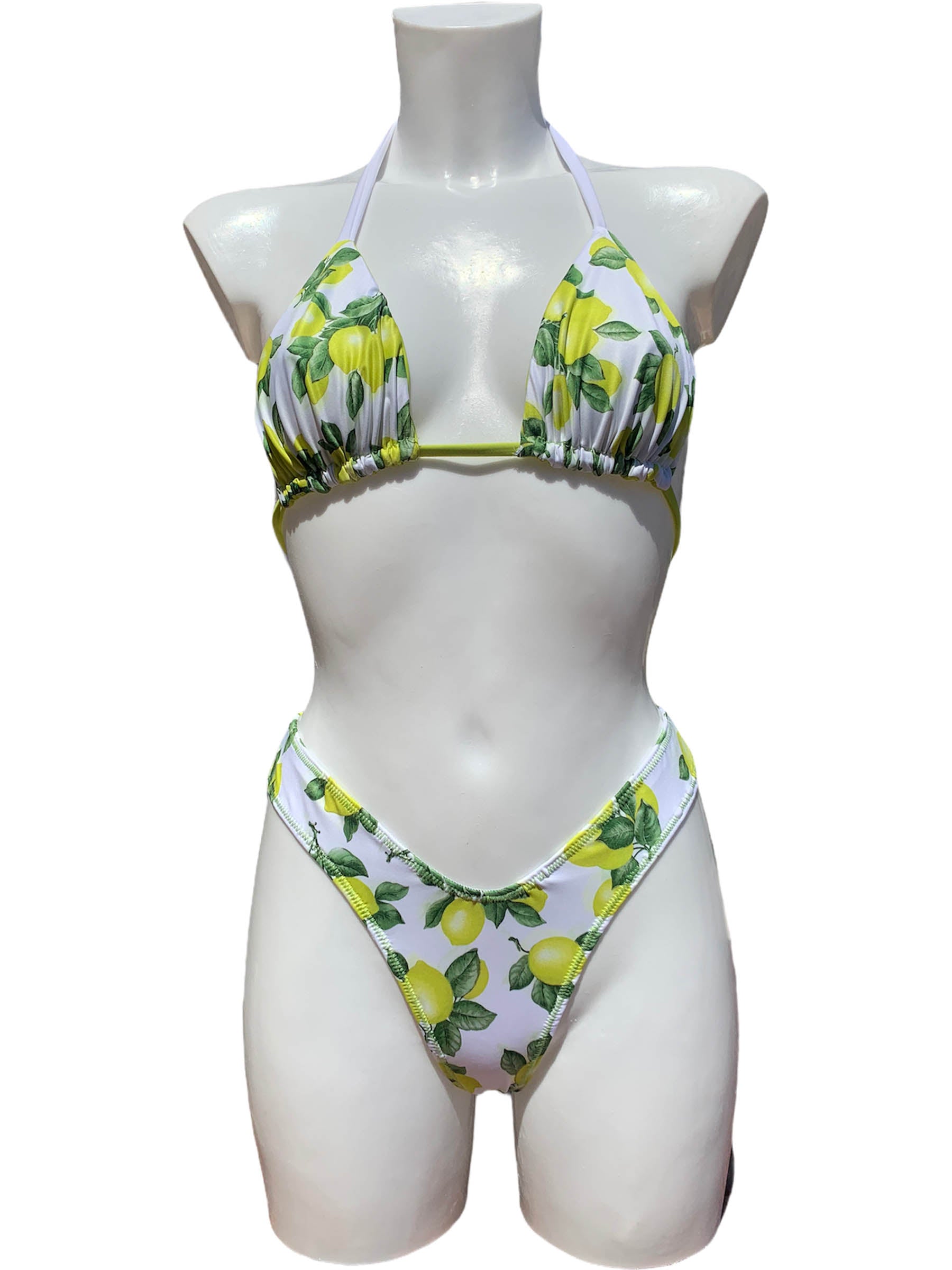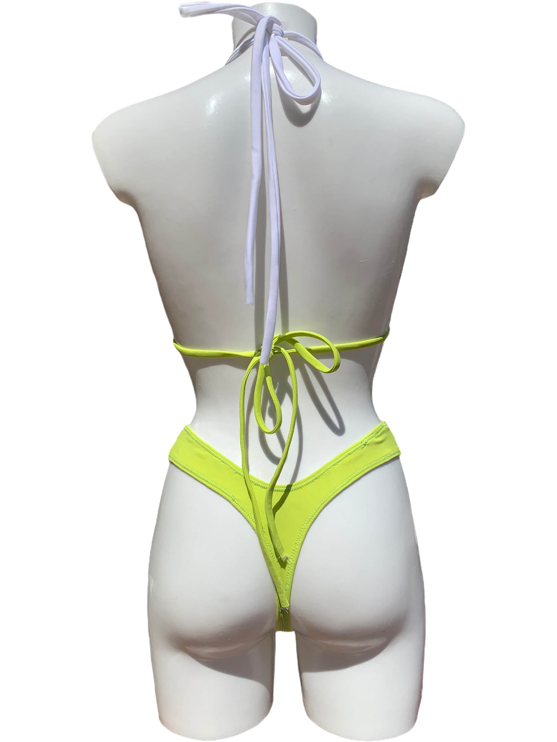 Elige que estilo de braguita prefieres: tanga, brasileña o braguita; con la parte delantera en estampado y la trasera en lima, la parte de arriba top triangulo reversible en tejido estampado y por el otro lado lima; con tiras en blanco y lima, ajustado a cuello y espalda, adaptable a cualquier medida de pecho.