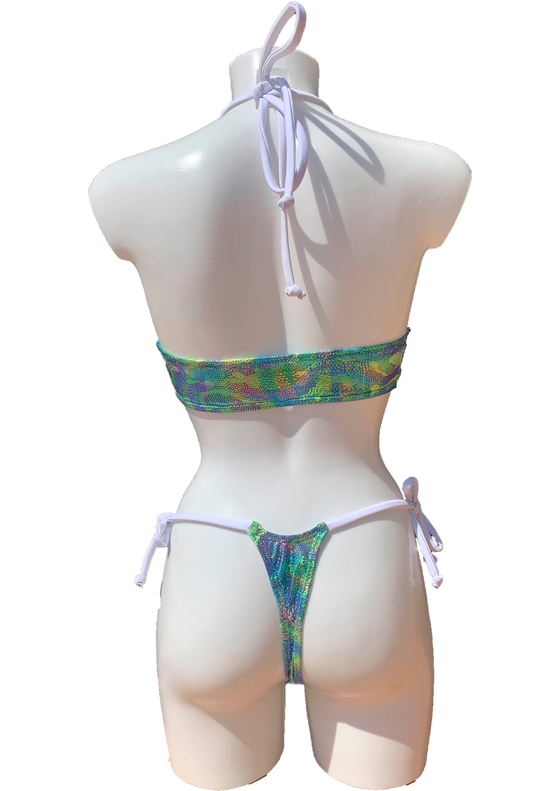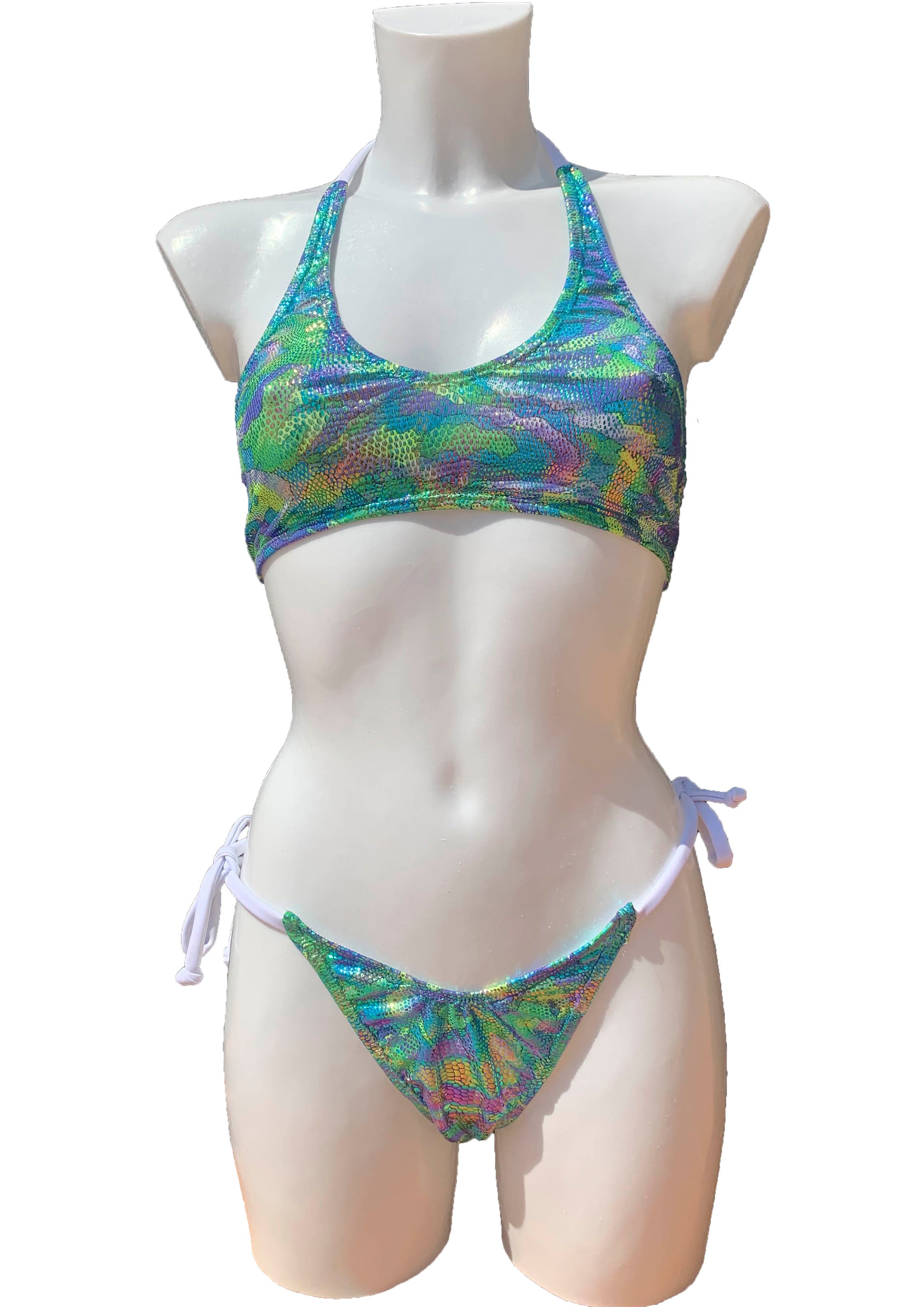Bikini de dos piezas en tejido holografíco en tonos verde, lila y azul. La braguita es de estilo tanga con dos lazadas y la parte de arriba se anuda al cuello.