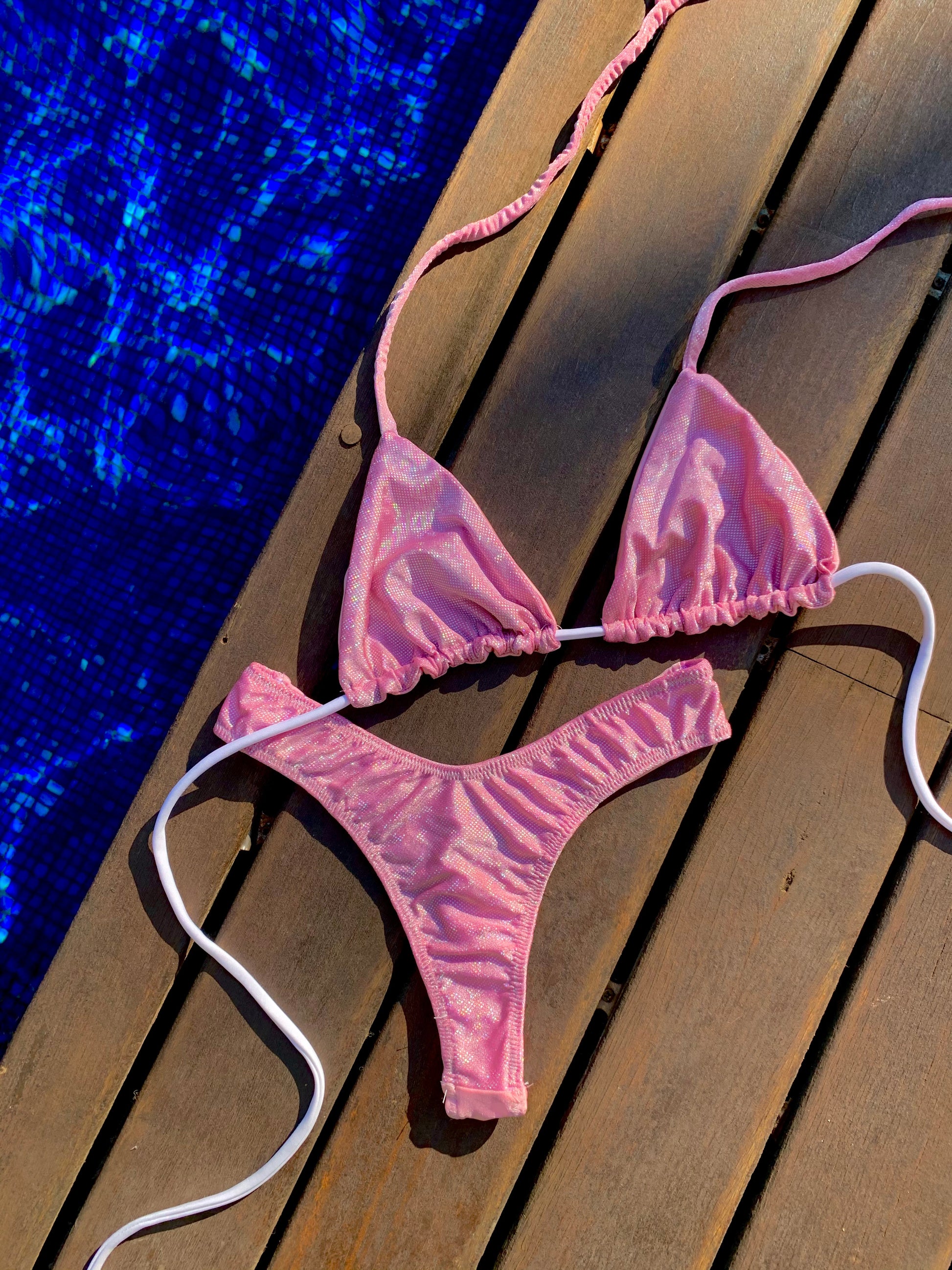 Bikini de dos piezas en dos tejidos, rosa brillo y rosa palo.