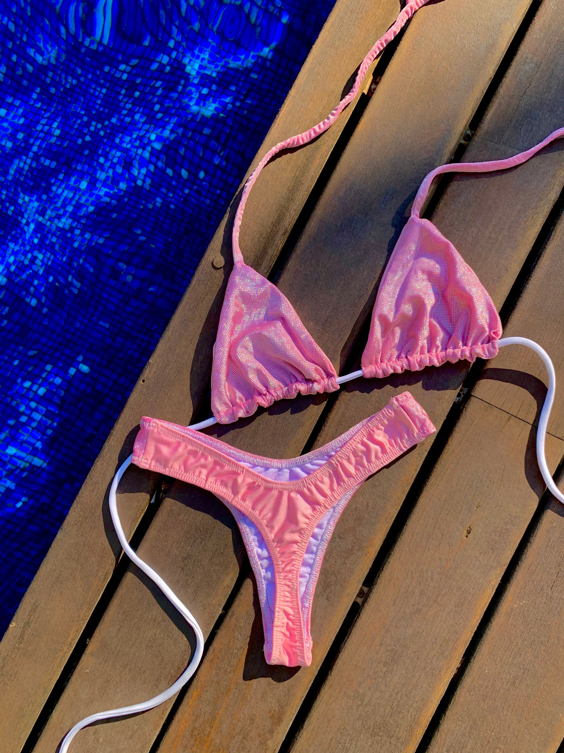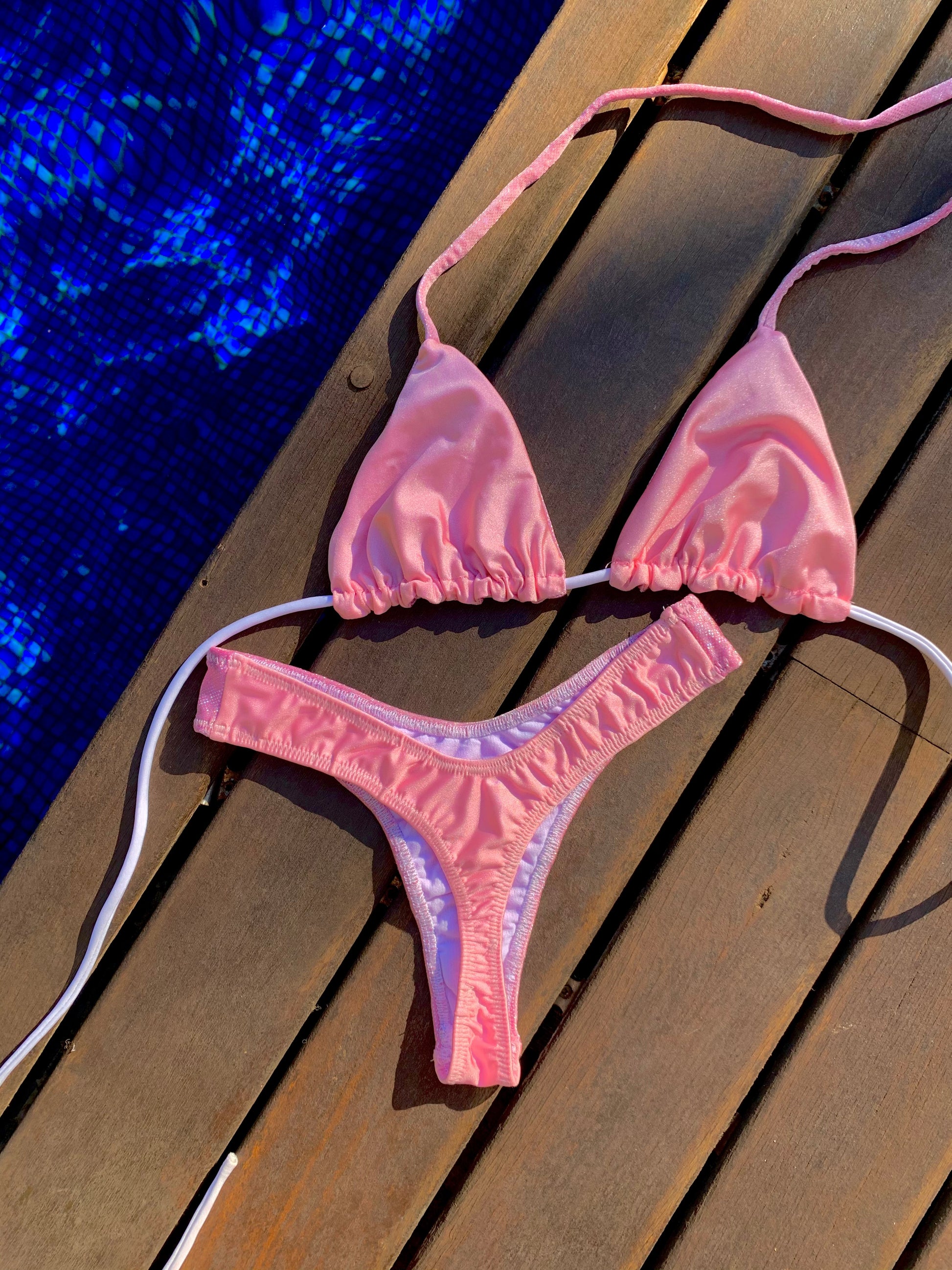 Elige que estilo de braguita prefieres: tanga, brasileña o braguita. Con la parte delantera en rosa brillante y la trasera en rosa palo y la parte de arriba top triangulo reversible en tejido rosa brillo y por el otro lado rosa palo; con tiras en rosa y blanco, ajustado a cuello y espalda, adaptable a cualquier medida de pecho.