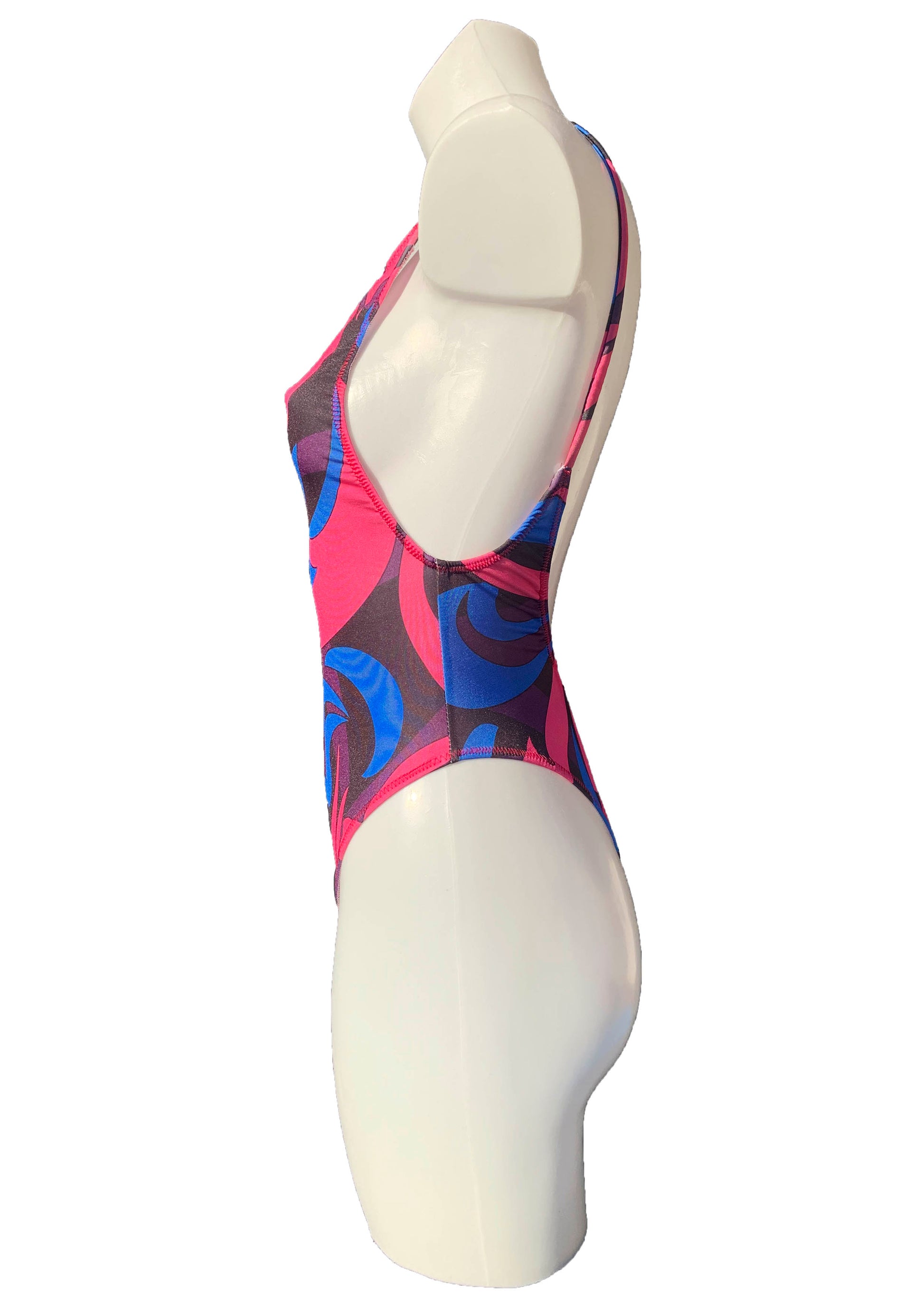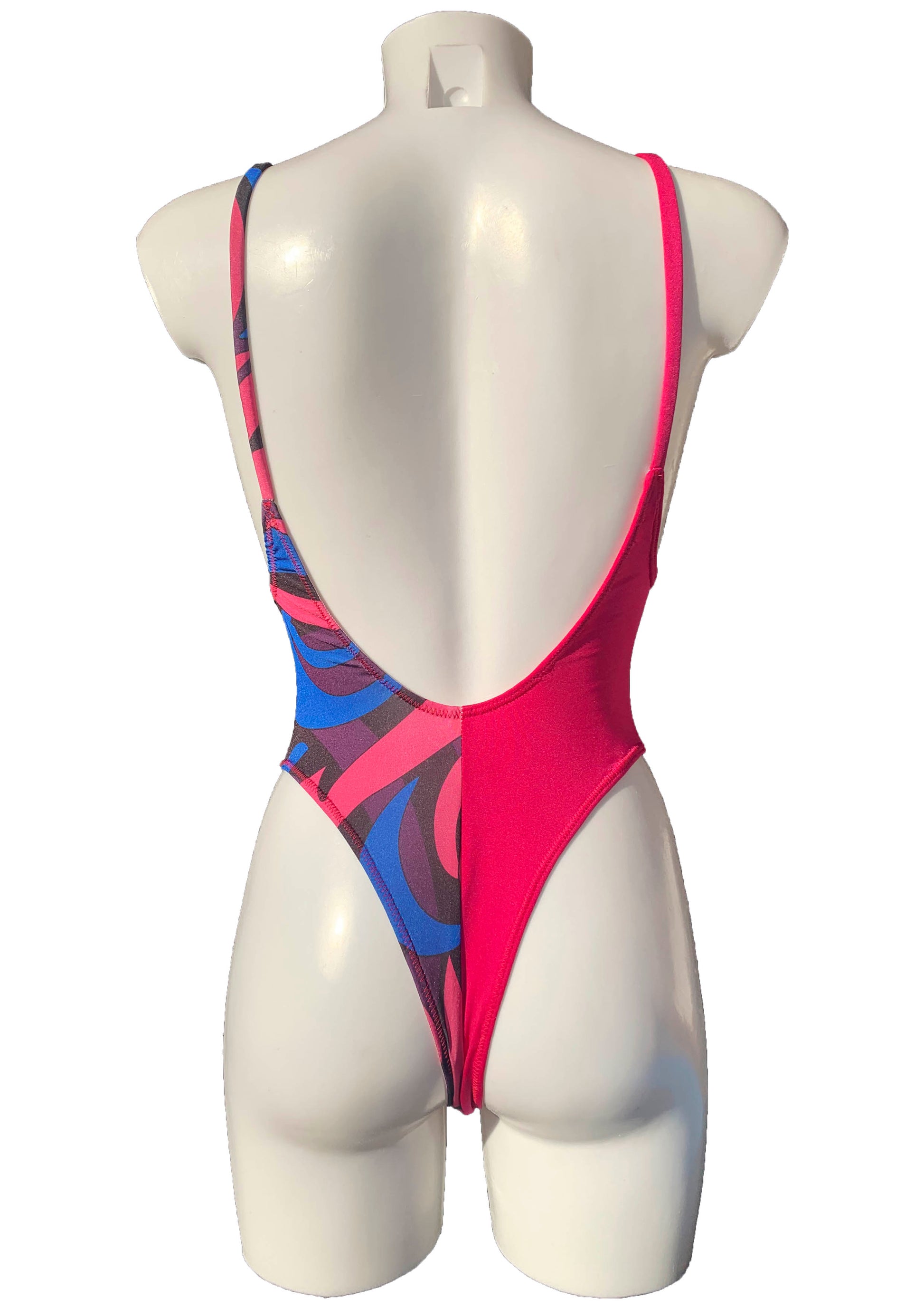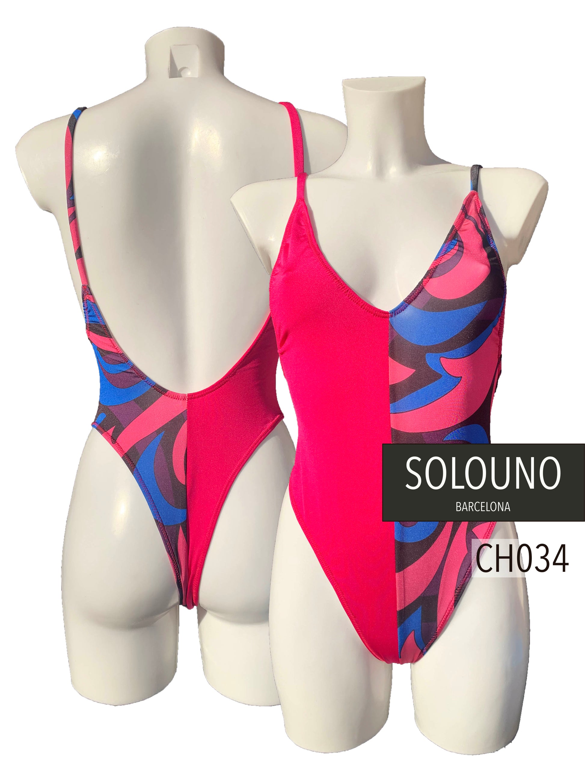 Bañador básico en dos tejidos, fucsia y estampado, con escote en la espalda, tirantes finos y braguita tipo tanga.