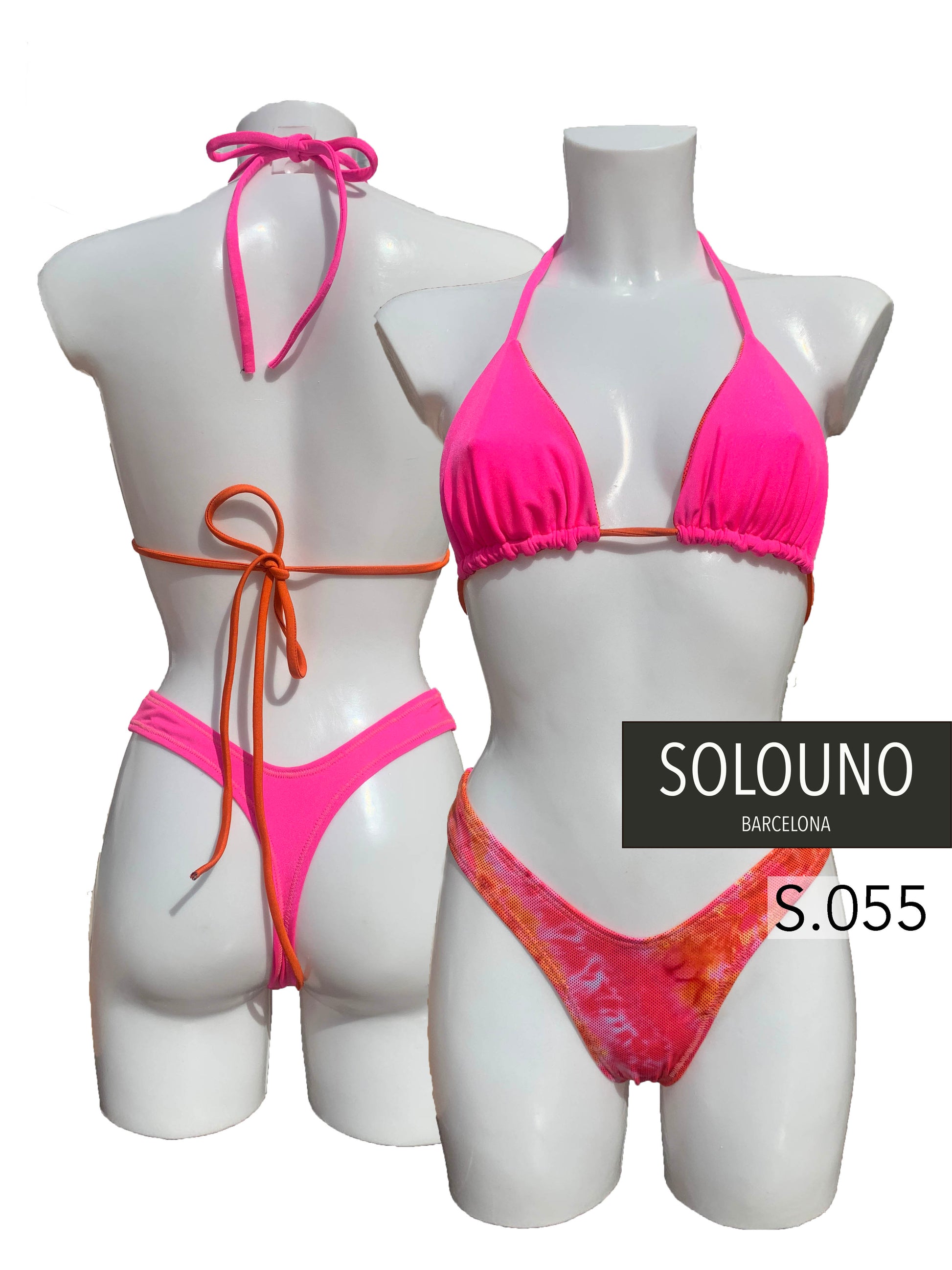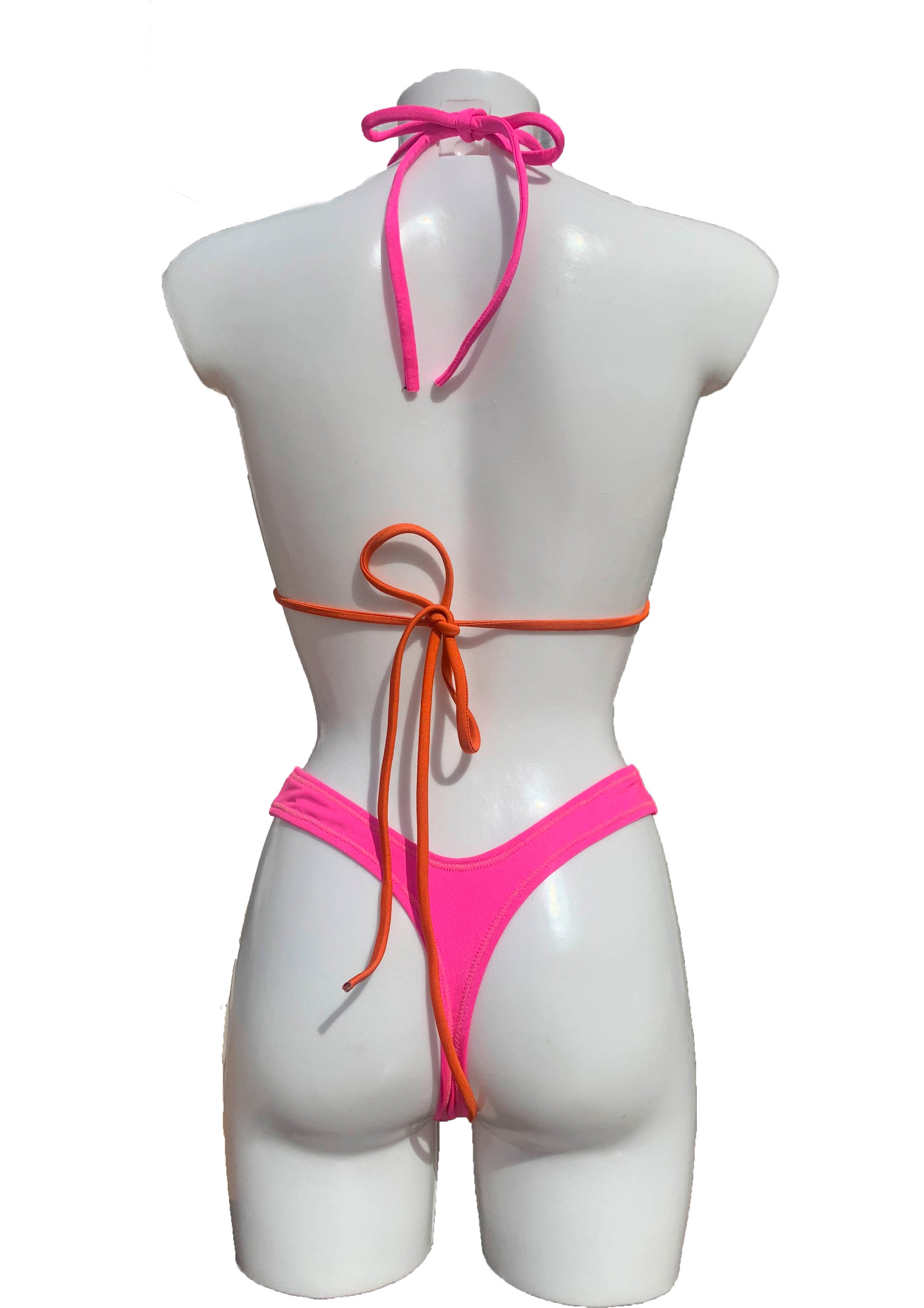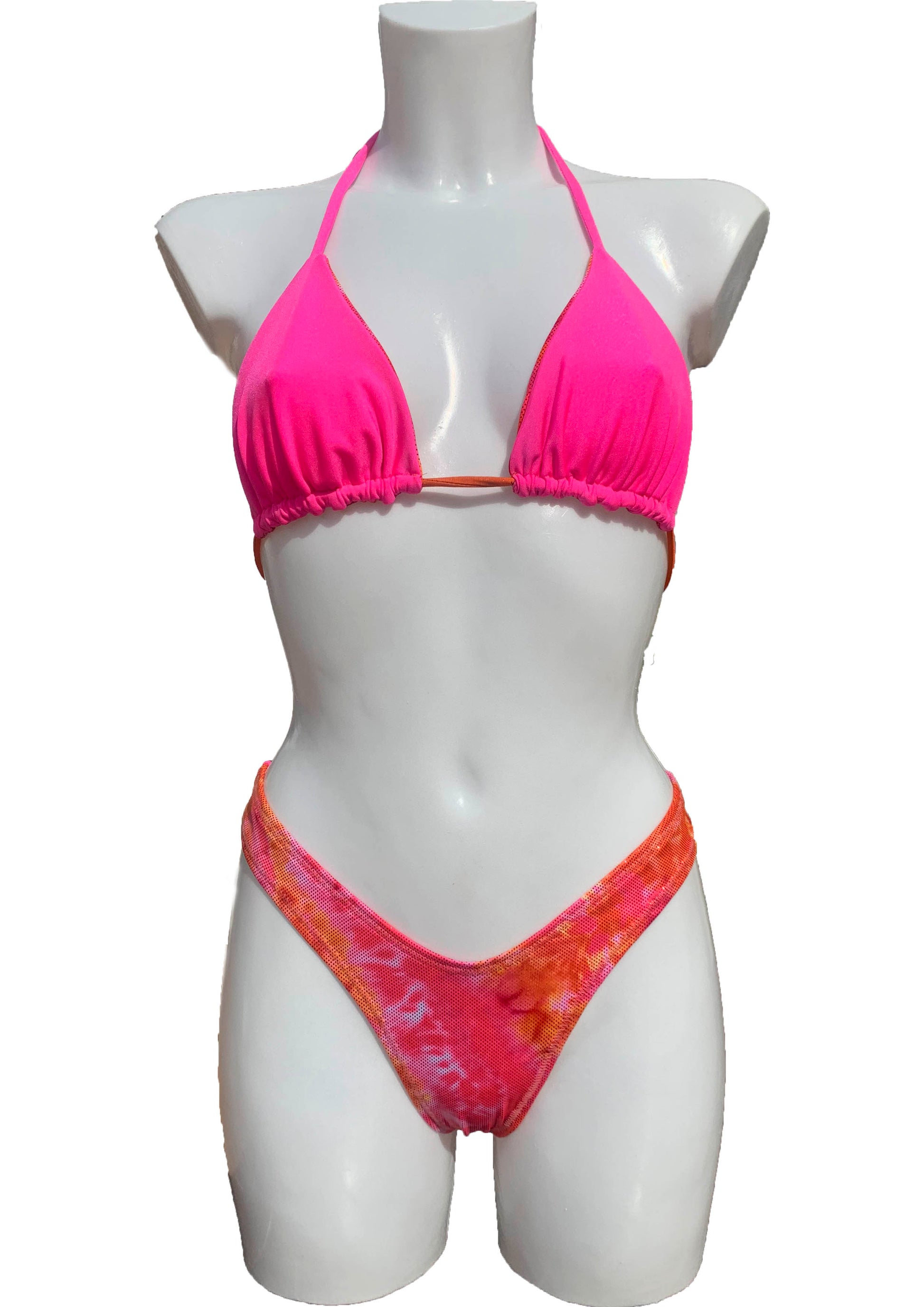 Elige que estilo de braguita prefieres: tanga, brasileña o braguita con la parte delantera en estampado brillante y la trasera en fucsia y la parte de arriba top triangulo reversible en tejido estampado brillante y por el otro lado fucsia; con tiras en naranja y fucsia, ajustado a cuello y espalda, adaptable a cualquier medida de pecho.