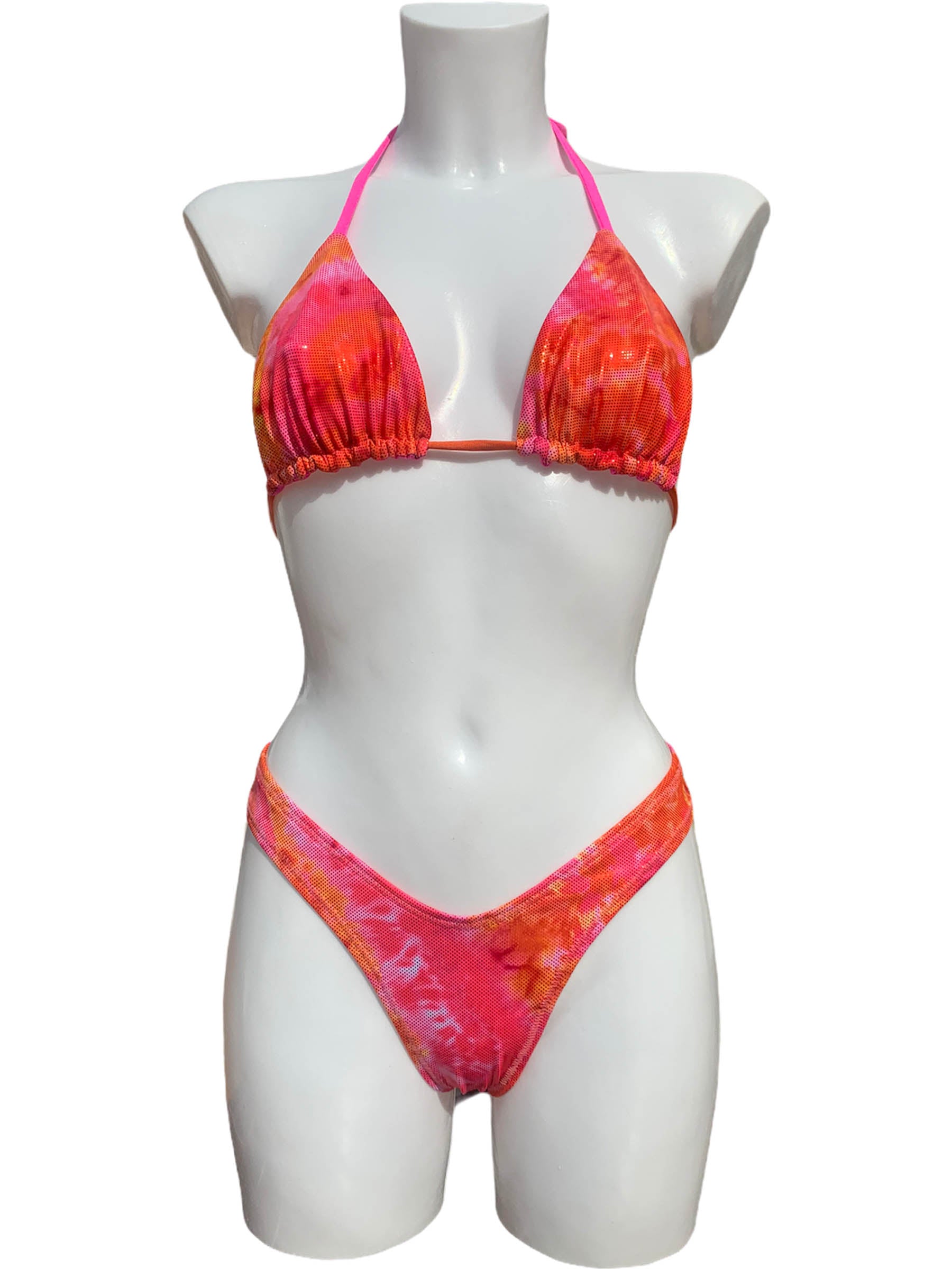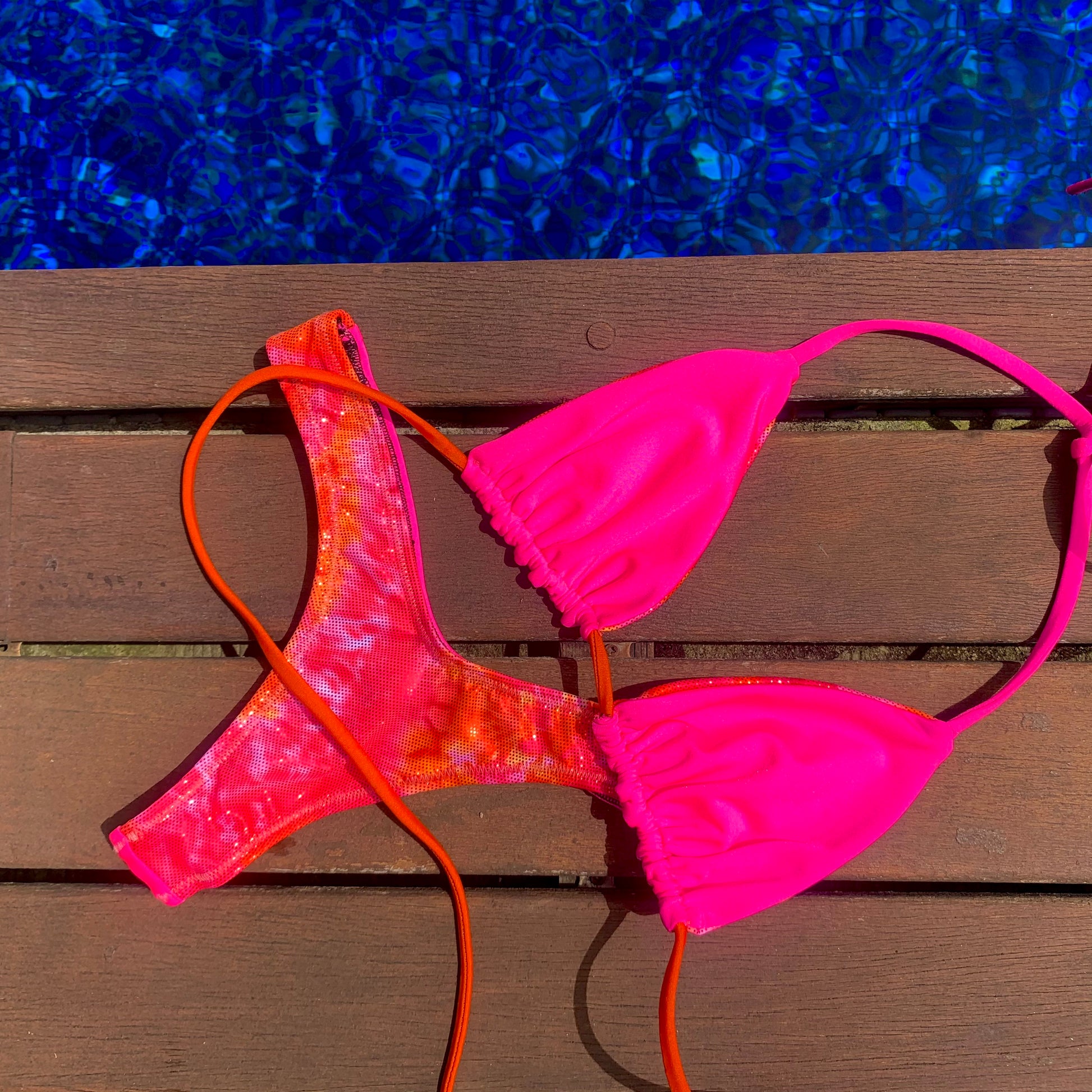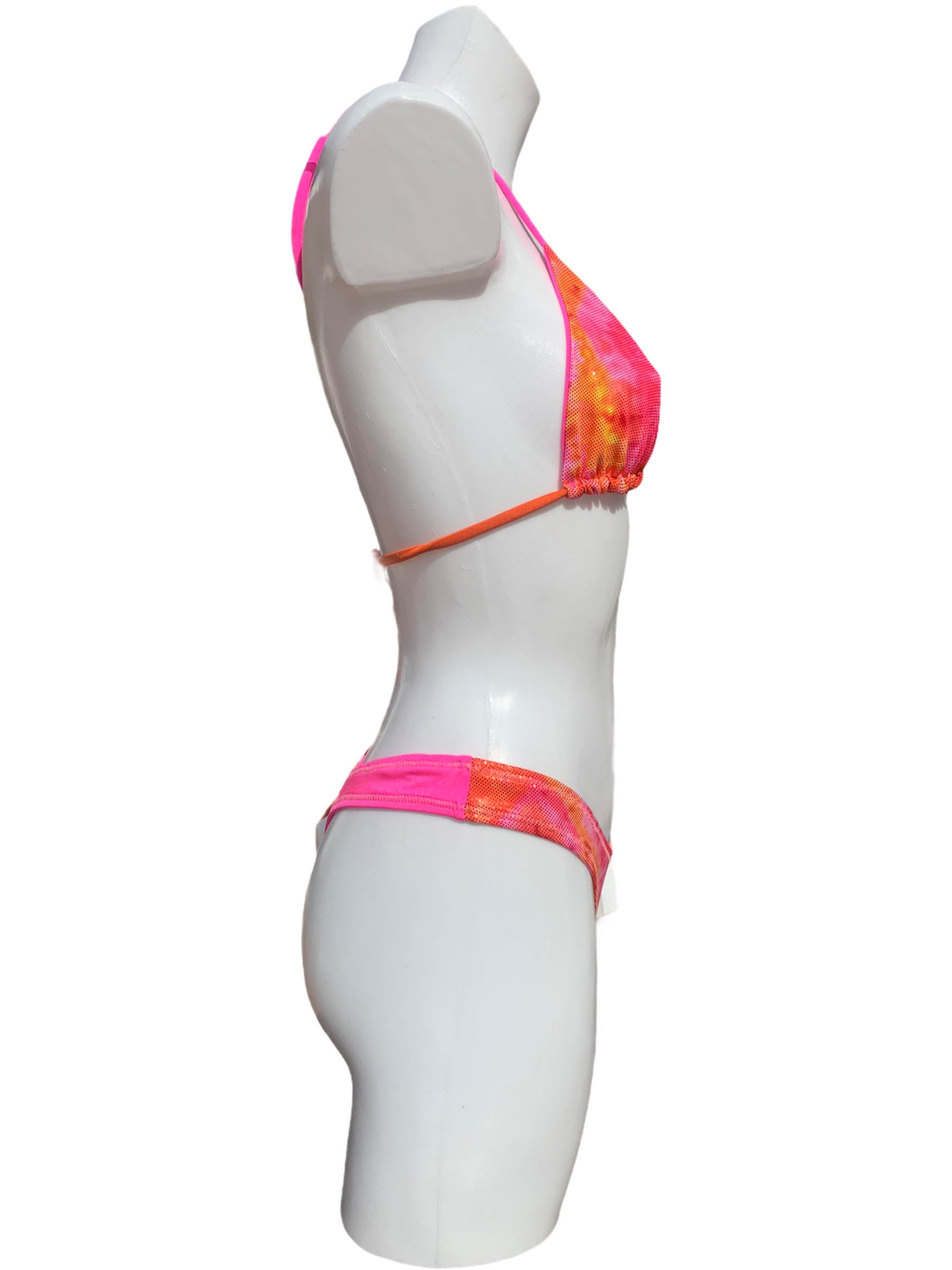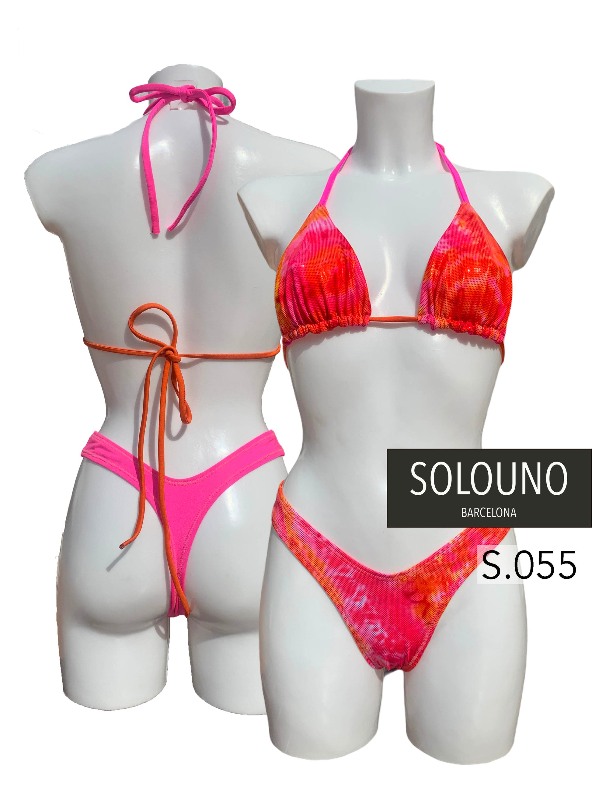 Elige que estilo de braguita prefieres: tanga, brasileña o braguita con la parte delantera en estampado brillante y la trasera en fucsia y la parte de arriba top triangulo reversible en tejido estampado brillante y por el otro lado fucsia; con tiras en naranja y fucsia, ajustado a cuello y espalda, adaptable a cualquier medida de pecho.